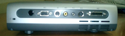 Задняя панель изобилует интерфейсами. Источниками видеосигнала могут служить устройства, подключенные к проектору через входы VESA M1, S-Video, RCA. Для воспроизведения звука через встроенный динамик предусмотрен аудиовход. Для параллельного вывода изображения на монитор на девайсе предусмотрен разъем под 15-штырьковый D-Sub VGA видеовыход. Рядом с ним находится разъем RS232 для сервиса и инфракрасный приемник. Вот вроде и все разъемы - согласитесь, полный набор необходимых функций для такого компактного зверя.