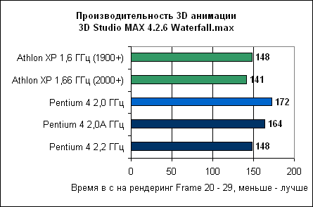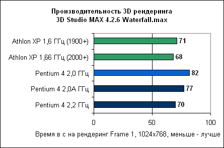Рендеринг первого кадра сцены с водопадом на 3D Studio MAX 4.2.6 (с оптимизацией под Pentium 4) показывает то же самое, что и Maya. Разницу в 3% между результатами 2000+ и 2,2 ГГц Pentium 4 вы вряд ли даже заметите.