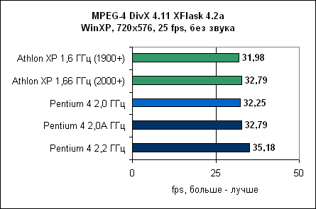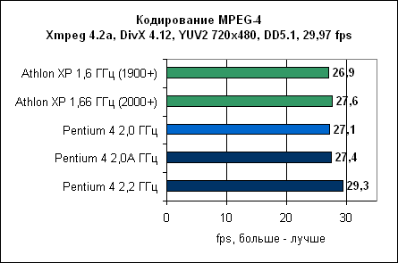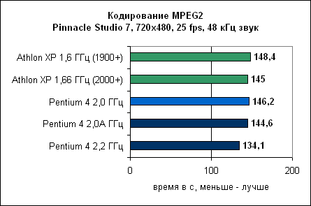 В кодировании MPEG-2 фильма с Pinnacle Studio 7 Intel Pentium 4/2200 определенно быстрее AMD Athlon XP 2000+. В этом тесте Intel получает преимущество из-за более высокой тактовой частоты Pentium 4 и от увеличившегося L2 кэша.