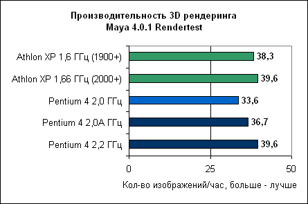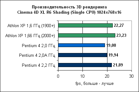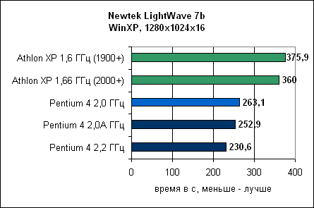 В тесте Lightwave явно лидирует Pentium 4. Если Pentium 4 2,2 ГГц понадобилось 230 секунд для рендеринга, то Athlon XP 2000+ затратил 360 секунд.