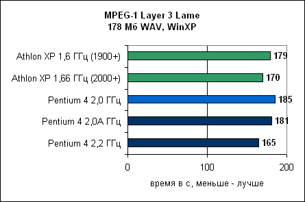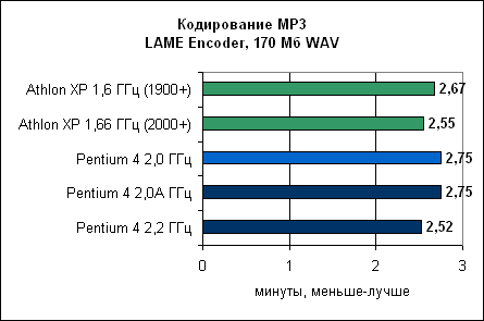 Мы использовали Lame MP3 Encoder для преобразования 178 Мб WAV файла в MPEG-1 Layer 3 формат под Windows XP. Как видим, Pentium 4 2,2 ГГц получил 5-секундное превосходство над AMD Athlon XP 2000+.