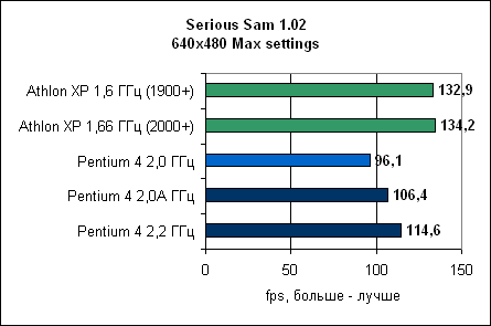 И завершает наше тестирование игровая производительность в Quake III Arena, Return to Castle Wolfeinstein и Serious Sam. Все игры запускались с разрешением 640x480, чтобы максимально снизить влияние видеоядра, хотя на GeForce3 Ti 500 (а особенно на следующем поколении видеокарт) что 1024x768, что 640x480 – все примерно одинаково.