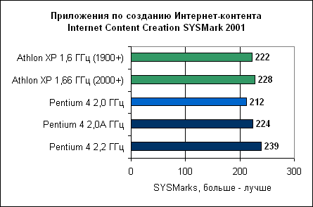 В прошлом году с патчем поддержки SSE Athlon XP стал лидировать в тестах по созданию Интернет-контента SysMark 2001, но сейчас Northwood вышел вперед. 2,2 ГГц Pentium 4 обгоняет Athlon XP 2000+ чуть меньше, чем на 5%.