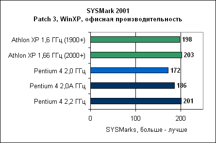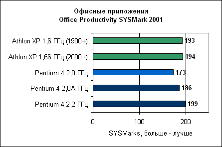 Сила AMD Athlon XP 2000+ проявляется в офисной производительности: с 203 очками в SysMark 2001 Athlon XP все же обогнал Pentium 4 2,2 ГГц.