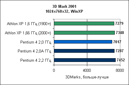 3D Mark 2000 показывает производительность Direct3D в DirectX 7 под Windows XP. Из-за своей поддержки SSE (3DNow! Professional), AMD Athlon XP смог выйти в лидеры.