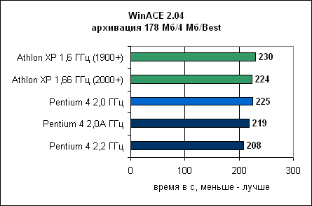 Архивация часто нужна в жизни. С помощью WinACE 2.04 под Windows XP мы сжимали 178 Мб WAV файл. Здесь Intel Pentium 4/2200 явно вырвался вперед AMD Athlon XP 2000+.