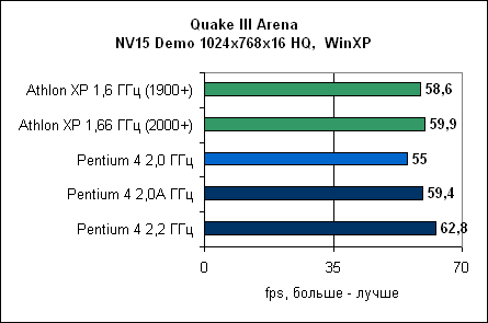 Когда Pentium 4 только стартовал, Quake III Arena показывала с ним очень хорошие результаты. Однако появление быстрых DDR платформ под Athlon и выпуск Athlon XP изменили ситуацию. Pentium 4 смог вернуть былое лидерство только благодаря новому ядру Northwood. XP 2000+ получил двух новых соперников.
