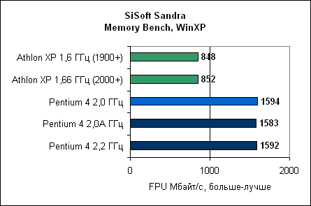 В двух тестах SiSoft Sandra 2001 AMD Athlon XP 2000+ вышел на первое место. Как обычно, Pentium 4 2,2 ГГц является бесспорным лидером в тесте пропускной способности памяти. Тем не менее, следует с осторожностью относиться к результатам этого теста в силу его синтетической природы. SiSoft Sandra лучше всего подойдет «разгонщикам», страждущим увидеть пару процентов увеличения производительности на своем процессоре.