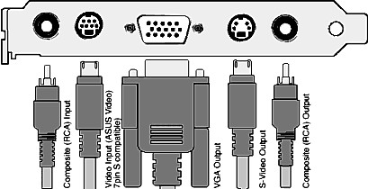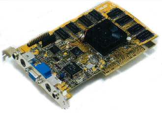 В красивой коробке находится: видеокарта, инструкция по эксплуатации на английском языке, один CD-диск с драйверами и утилитами и еще один CD-диск с полной версией игры "Incoming" от Rage Software, также прилагаются кабеля для ввода/вывода видео. ASUS выпускает видеокарты отличающиеся объемом и типом видеопамяти:16MB SDRAM и 8MB SGRAM, в нашем случае это была модель оснащенная 7-наносекундной SDRAM памятью объемом в 16MB. На чип прикреплен активный кулер с питанием от платы. На заднюю панель выведены следующие разъемы: VGA, RCA-input, S-video input, RCA-output, S-video output.