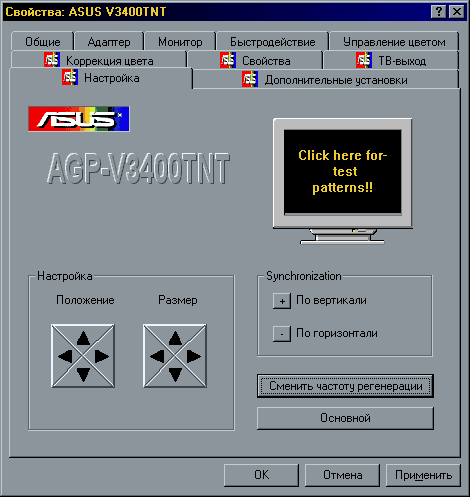 Драйвера от ASUS имеют большое количество настроек для различных режимов работы. Стоит обратить внимание на настройку частоты регенерации монитора, в драйверах от ASUS'а есть прекрасная возможность установить любую частоту с шагом в 1Hz, это позволило на мониторе SONY-100SX установить режим 1024х768 с недокументированной частотой 80Hz (документировано - 1024х768х75Hz). В закладке Дополнительные установки откавается доступ к настройкам параметров работы 3D-ускорителя, такое большое количество настроек не найти даже в самой универсальной программе настройки современных 3D-ускорителей PowerStrip. TV-выход работает только в разрешениях 640х480 и 800х600, можно выводить изображение как раздельно, так и одновременно на экран телевизора и монитор. Настройки TV-выхода позволяют произвести юстировку изображения на экране телевизора, включить фильтр подавления мерцания. Все настройки можно увидеть на скриншоте снизу.