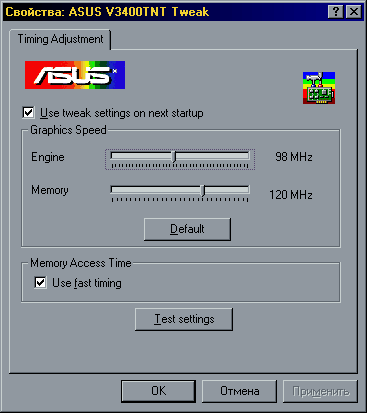 Специально для разгона видеокарты ASUSTeK выпустил утилиту ASUS Tweak, в которой есть возможность установки частот на которых будут работать чипсет (Engine) и видеопамять (Memory), а также возможность установки быстрого доступа к памяти. Максимальные установки при которых у меня не было ни зависаний, ни искажений изображения: чипсет - 98MHz, память - 120MHz при включенной опции Fast memory timing. Прирост в скорости при разгоне получается незначительный, не больше 5-10%, но при этом возможна некоректная работа видеокарты. Но если уж вы решили разогнать, то я рекомендую обратить внимание на установки видеопамяти, т.к. основная нагрузка при работе в режиме truecolor ложится именно на нее. Увеличив частоту работы памяти вы увеличиваете ее пропускную способность, а это положительным образом скажется на играх в режиме truecolor.