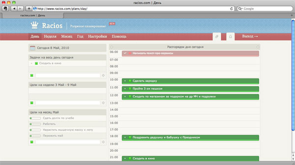 Ресурс Racios.com агитирует за разумное планирование, то есть за детальное расписывание задач. Каждую задачу можно приурочить к определенному часу, дню, месяцу и даже году (что будет полезно, если ваши планы простираются столь далеко). Сводные таблицы будут постоянно напоминать вам, куда вы идете и к чему стремитесь, чтобы не забыть об этом в повседневной суете.