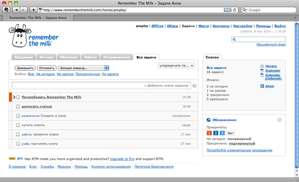 Многолетний помощник адептов планирования, сервис, позволяющий не допустить ситуации а-ля «Ой, а у меня молоко убежало» , а также дедлайнов, авралов и досадных случайностей — безусловно, RemeberTheMilk.
