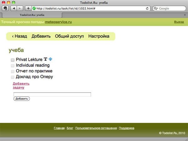 Русскоязычный сервис Todolist.ru, по сути, несильно отличается от вышеупомянутого органайзера: то же составление списка дел, разделение задач на составляющие части и привязка к временным отрезкам; та же возможность поделиться списком с товарищем. Разница заметна лишь в интерфейсе, который чуть менее нагляден и не позволяет с легкостью сдвигать задачи по времени.