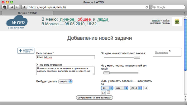 Небольшой органайзер Wygd.ru работает по принципу создания облачков (так называемых «облаков тегов»). Дружелюбный и неформальный сервис предлагает записать списки необходимых задач, присвоить им дату выполнения (крайний срок), объективную важность, субъективную важность (что-то вроде "не хочется, но надо"). Исходя из представленных данных, задаче присваивается размер шрифта, которым она, собственно, и обозначается в общем облаке задач. По мере приближения срока выполнения задача будет «расти». Как только вы сделаете задачу или необходимость в выполнении отпадет, ее можно удалить или отложить на неопределенный срок, и запись либо исчезнет из облака, либо «сдуется».