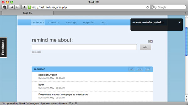 Task.fm англоязычный сервис для создания задач и их своевременного выполнения. Вы регистрируетесь, создаете дела и настраиваете напоминания, которые будут приходить по почте или SMS. Все как обычно, за исключением одной приятной особенности - данный сервис можно интегрировать с Twitter. Именно поэтому длина текста напоминания не должна превышать 140 символов. Впрочем, для большинства повседневных задач этого вполне достаточно.