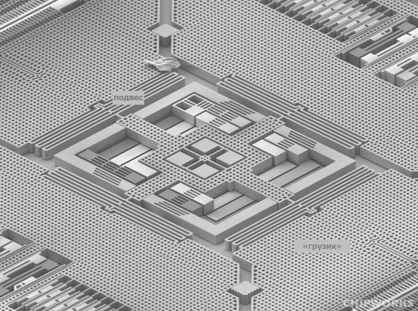 Это теория. На практике, MEMS-акселерометры устроены таким образом, что отделить друг от друга составные части – грузик, подвес, корпус и обкладки конденсатора – не так-то просто. Собственно, изящество MEMS в том и заключается, что в большинстве случаев в одной детали здесь удается (а вернее, попросту приходится) комбинировать сразу несколько предметов.