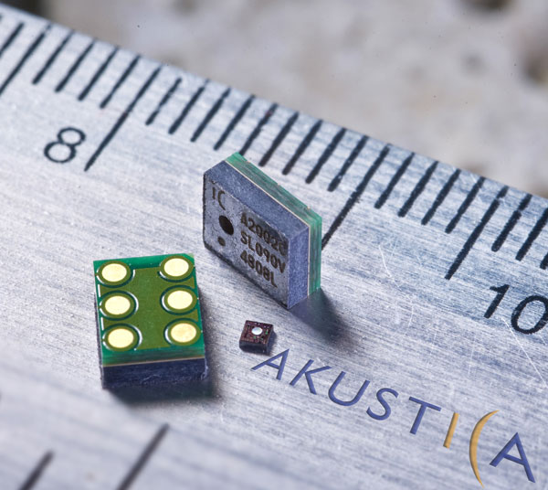 Самый миниатюрный MEMS-микрофон компании Akustica (площадь кристалла – 1 кв.мм) теряется рядом со своими более крупными родственниками