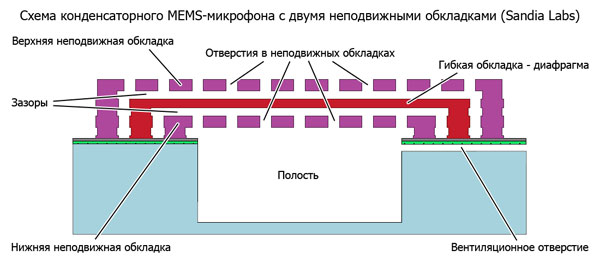 Менее популярный в статьях и обсуждениях, но гораздо более массовый тип MEMS-устройств – микроскопические микрофоны. Опять-таки, наиболее распространенными системами этого типа являются те, которые основаны на конденсаторном принципе.