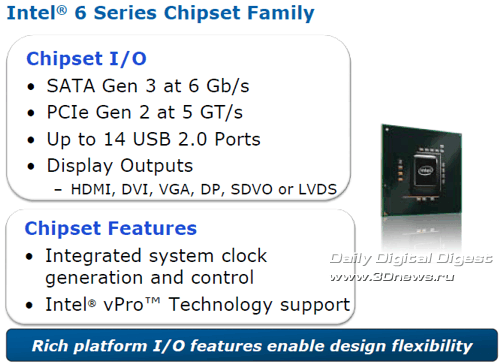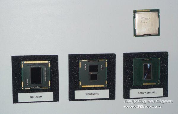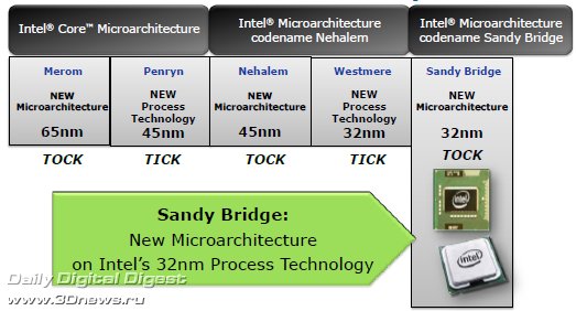 Несколько лет назад, во времена господства бренда Pentium, первого появления торговой марки Intel Core и одноимённой микроархитектуры (Architecture 101), на слайдах о будущих процессорах впервые было упомянуто следующее поколение микроархитектуры Intel с рабочим названием Gesher ("мост" на иврите), что чуть позже трансформировалось в Sandy Bridge.  В ту давнюю пору господства процессоров NetBurst, когда только-только начали проступать контуры грядущих ядер Nehalem, а мы знакомились с особенностями внутреннего строения первых представителей микроархитектуры Core - Conroe для настольных систем, Merom - для мобильных и Woodcrest - для серверных… Словом, когда трава была зелёная, а до Sandy Bridge было ещё как до Луны, уже тогда представители Intel говорили, что это будет совершенно новая процессорная микроархитектура. Именно так, cкажем, сегодня можно представить таинственную микроархитектуру Haswell, которая появится после поколения Ivy Bridge, которое, в свою очередь, придёт на смену Sandy Bridge в следующем году.  Однако чем ближе дата выпуска новой микроархитектуры, чем больше мы узнаём об её особенностях, тем больше становятся заметны сходства соседних поколений, и тем более очевиден эволюционный путь изменений в схемотехнике процессоров. И действительно, если между начальными реинкарнациями первой архитектуры Core - Merom/Conroe, и первенцем второго поколения Core – Sandy Bridge - на самом деле пролегает пропасть различий, то нынешняя последняя версия поколения Core - ядро Westmere - и грядущая, рассматриваемая сегодня первая версия поколения Core II - ядро Sandy Bridge, могут показаться схожими. И всё же различия существенны. Настолько существенны, что теперь окончательно можно говорить о конце 15-летней эпохи микроархитектуры P6 (Pentium Pro) и о появлении нового поколения микроархитектуры Intel. ⇡#Микроархитектура Sandy Bridge: с высоты птичьего полётаЧип Sandy Bridge – это четырёхъядерный 64-битный процессор с изменяемой (out-of-order) последовательностью исполнения команд, поддержкой двух потоков данных на ядро (HT), исполнением четырёх команд за такт; с интегрированным графическим ядром и интегрированным контроллером памяти DDR3; с новой кольцевой шиной, поддержкой 3- и 4-операндных (128/256-битных) векторных команд расширенного набора AVX (Advanced Vector Extensions); производство которого налажено на линиях с соблюдением норм современного 32-нм технологического процесса Intel.  Так, вкратце, одним предложением можно попробовать охарактеризовать новое поколение процессоров Intel Core II для мобильных и настольных систем, массовые поставки которых начнутся в самое ближайшее время.   Процессоры Intel Core II на базе микроархитектуры Sandy Bridge будут поставляться в новом 1155-контактном конструктиве LGA1155 под новые системные платы на чипсетах Intel 6 Series.