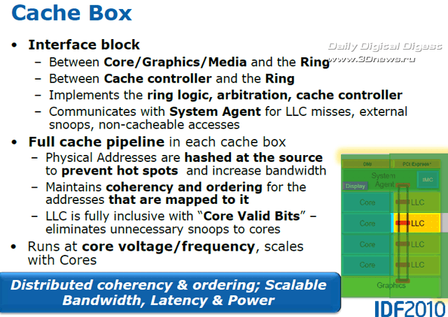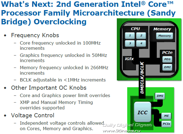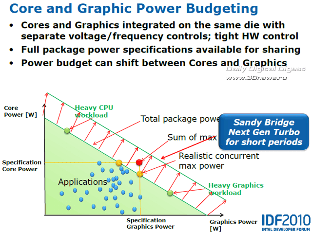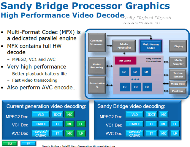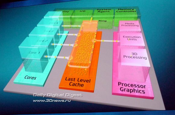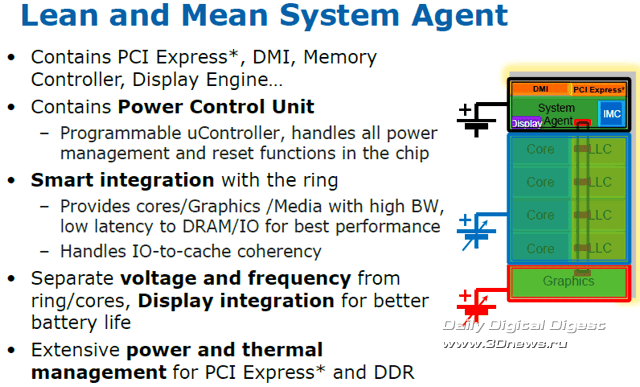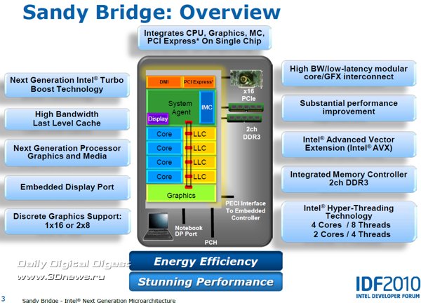 Насколько эффективно эта технология будет работать в серийных процессорах, нам ещё предстоит узнать, но то, что показывали специалисты Intel во время закрытой демонстрации возможностей Sandy Bridge в дни IDF в Сан Франциско, просто поражает: и прирост тактовой частоты, и, соответственно, производительность процессора и графики, одномоментно могут достичь просто фантастических уровней. Есть информация, что для штатных систем охлаждения режим такого «разгона» с помощью Turbo Boost и превышением TDP будет ограничен в BIOS периодом в 25 секунд. Но что если производители системных плат смогут гарантировать более качественный отвод тепла с помощью какой-нибудь экзотической системы охлаждения? Тут и открывается раздолье для оверклокеров…  Каждое из четырёх ядер Sandy Bridge может быть при необходимости независимо переведено в режим минимального энергопотребления, графическое ядро также можно перевести в очень экономичный режим. Кольцевая шина и кеш L3, в силу их распределения между другими ресурсами, не могут быть отключены, однако для кольцевой шины предусмотрен специальный экономичный ждущий режим, когда она не нагружена, а для кеш-памяти L3 применяется традиционная технология отключения неиспользуемых транзисторов, уже известная нам по предыдущим микроархитектурам. Таким образом, процессоры Sandy Bridge в составе мобильных ПК обеспечивают длительную автономную работу при питании от аккумулятора. Модули видеовыхода и мультимедийного аппаратного декодирования также входят в число элементов системного агента. В отличие от предшественников, где аппаратное декодирование было возложено на графическое ядро (о его возможностях мы поговорим в следующий раз), в новой архитектуре для декодирования мультимедийных потоков используется отдельный, гораздо более производительный и экономичный модуль, и лишь в процессе кодирования (сжатия) мультимедийных данных используются возможности шейдерных блоков графического ядра и кеш L3.  В соответствии с современными веяниями, предусмотрены инструменты воспроизведения 3D-контента: аппаратный модуль декодирования Sandy Bridge способен без труда обрабатывать сразу два независимых потока MPEG2, VC1 или AVC в разрешении Full HD. Сегодня мы познакомились со структурой нового поколения микроархитектуры Intel Core II с рабочим названием Sandy Bridge, разобрались со строением и принципом работы ряда ключевых элементов этой системы: кольцевой шины, кеш-памяти L3 и системного агента, в состав которого входит контроллер памяти DDR3, модуль управления питанием и другие компоненты. Однако это лишь малая часть новых технологий и идей, реализованных в микроархитектуре Sandy Bridge, не менее впечатляющие и масштабные изменения коснулись архитектуры процессорных ядер и интегрированной графической системы. Так что на этом наш рассказ о Sandy Bridge не заканчивается - продолжение следует.  ⇡#Ссылки по теме: