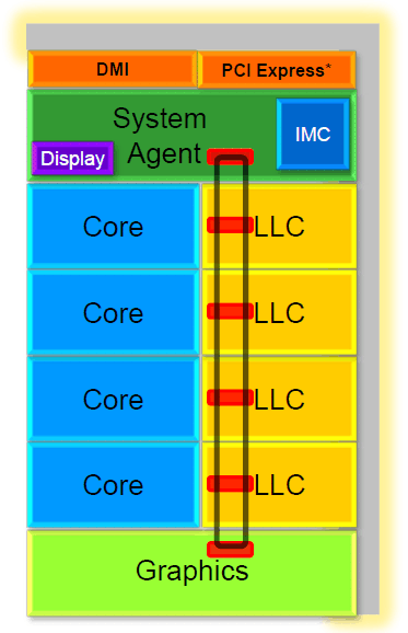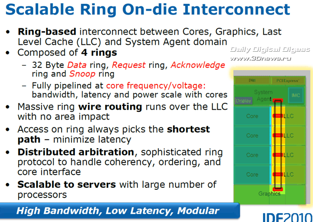 Примерно такая же микроархитектура будет актуальна и для серверных решений Intel Sandy Bridge-EP, разве что с актуальными отличиями в виде большего количества процессорных ядер (до восьми), соответствующего процессорного разъёма LGA2011, большего объёма кеша L3, увеличенного количества контроллеров памяти DDR3 и поддержкой PCI-Express 3.0.  Предыдущее поколение, микроархитектура Westmere в исполнении Arrandale и Clarkdale для мобильных и настольных систем, представляет собой конструкцию из двух кристаллов - 32-нм процессорного ядра и дополнительного 45-нм «сопроцессора» с графическим ядром и контроллером памяти на борту, размещённых на единой подложке и производящих обмен данными посредством шины QPI. По сути, на этом этапе инженеры Intel, используя преимущественно предыдущие наработки, создали этакую интегрированную гибридную микросхему. При создании архитектуры Sandy Bridge разработчики закончили начатый на этапе создания Arrandale/Clarkdale процесс интеграции и разместили все элементы на едином 32-нм кристалле, отказавшись при этом от классического вида шины QPI в пользу новой кольцевой шины. Суть микроархитектуры Sandy Bridge при этом осталась в рамках прежней идеологии Intel, которая делает ставку на увеличение суммарной производительности процессора за счёт улучшения «индивидуальной» эффективности каждого ядра.  Структуру чипа Sandy Bridge можно условно разделить на следующие основные элементы: процессорные ядра, графическое ядро, кеш-память L3 и так называемый «Системный агент» (System Agent). В общем и целом структура микроархитектуры Sandy Bridge понятна. Наша сегодняшняя задача – выяснить назначение и особенности реализации каждого из элементов этой структуры. ⇡#Кольцевая шина (Ring Interconnect)Вся история модернизации процессорных микроархитектур Intel последних лет неразрывно связана с последовательной интеграцией в единый кристалл всё большего количества модулей и функций, ранее располагавшихся вне процессора: в чипсете, на материнской плате и т.д. Соответственно, по мере увеличения производительности процессора и степени интеграции чипа, требования к пропускной способности внутренних межкомпонентных шин росли опережающими темпами. До поры до времени, даже после внедрения графического чипа в архитектуру чипов Arrandale/Clarkdale, удавалось обходиться межкомпонентными шинами с привычной перекрёстной топологией - этого было достаточно.  Однако эффективность такой топологии высока лишь при небольшом количестве компонентов, принимающих участие в обмене данными. В микроархитектуре Sandy Bridge для повышения общей производительности системы разработчики решили обратиться к кольцевой топологии 256-битной межкомпонентной шины, выполненной на основе новой версии технологии QPI (QuickPath Interconnect), расширенной, доработанной и впервые реализованной в архитектуре серверного чипа Nehalem-EX (Xeon 7500), а также планировавшейся к применению совместно с архитектурой чипов Larrabee. Кольцевая шина в версии архитектуры Sandy Bridge для настольных и мобильных систем (Core II) служит для обмена данными между шестью ключевыми компонентами чипа: четырьмя процессорными ядрами x86, графическим ядром, кешем L3 и системным агентом. Шина состоит из четырёх 32-байтных колец: шины данных (Data Ring), шины запросов (Request Ring), шины мониторинга состояния (Snoop Ring) и шины подтверждения (Acknowledge Ring), на практике это фактически позволяет делить доступ к 64-байтно