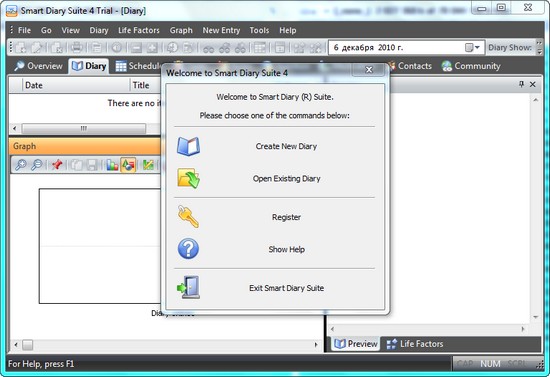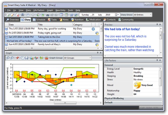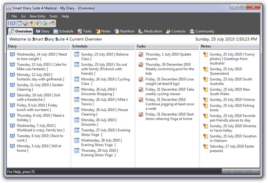 Для человека, который следит за своим здоровьем, очень важно вести статистику различных показателей - фиксировать в одно и то же время давление, мерить температуру, регулярно измерять свой вес и т.д. Записанные значения этих и любых других параметров удобно держать в электронном виде. Табличные данные можно вывести на печать и показать своему тренеру по фитнесу, послать по электронной почте лечащему врачу и т. д. Кроме того, электронная статистика дает возможность быстро проследить изменения, которые происходят в организме человека. Ну и, конечно же, этот дневник также можно использовать как обычный вариант ежедневника. ![]() Несмотря на то, что в программе достаточно много различных функций, ее интерфейс продуман настолько хорошо, что запутаться в них практически невозможно. Для удобства в Smart Diary Suite есть несколько разделов, которые представлены в виде аккуратных вкладок. На первой из них – Overview – отображается наиболее важная информация, занесенная в другие разделы. Эта вкладка показывается при запуске программы. Число записей, которые выводятся на вкладке, можно настраивать. Кроме этого, есть возможность изменения разметки этой страницы. Удобно, что для редактирования записей или добавления новых не требуется переключаться в другие разделы – все можно делать непосредственно из главного окна. ![]() Раздел Diary предназначен для добавления регулярных записей. Можно использовать возможности встроенного текстового редактора, работать с шаблонами, вставлять в записи файлы разных типов. Кроме этого, добавляя каждую запись, можно заполнять небольшую таблицу, в которой указывать состояние своего здоровья, вес, настроение, медикаменты, которые вы принимаете, продукты питания, которые входят в состав вашей диеты, и т.д. То, какие именно пункты будут в этой таблице, полностью зависит от пользователя. На основе данных, которые заносятся в эту таблицу, программа может строить графики. Записи можно организовывать по категориям, а также отбирать по разным критериям. ![]() Кроме своей основной функции – помощи в ведении дневника - Smart Diary Suite также предлагает множество вспомогательных. Так, программу можно использовать как полноценный органайзер с возможностью добавления одноразовых или повторяющихся напоминаний о разных событиях, средство для учета запланированных дел с возможностью установки их приоритета, а также указания процента выполнения, инструмент для добавления заметок, которые могут быть организованы по категориям. Поскольку программа ориентирована на людей, которые заботятся о своем здоровье, в ней есть отдельный раздел Nutrition, предназначенный для записи рецептов. Работая с базой данных, в которую внесена не только информация о способах приготовления блюд, но и об их калорийности, количестве соли, а также белков, жиров и углеводов, можно успешно планировать свою диету или ежедневное меню для всей семьи. А когда вы составите список блюд, которые неплохо было бы приготовить на следующей неделе, программа сгенерирует список продуктов, которые вам для этого понадобятся. Останется только распечатать его и отправиться в супермаркет. Функции, расположенные на вкладке Medication, будут полезны людям, которые вынуждены постоянно принимать лекарства. Smart Diary Suite может хранить базу данных прописанных медикаментов, а также информацию о том, 