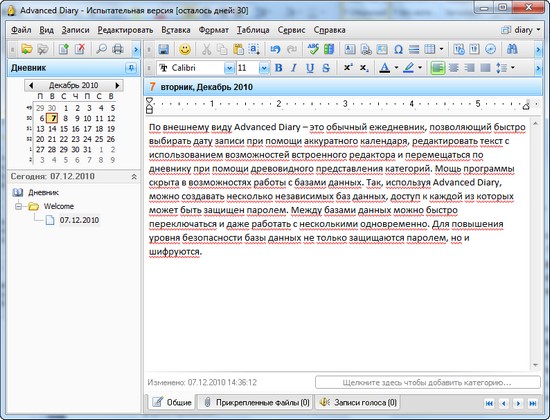 DiaryOne – это классическая программа для ведения личного дневника. С ее помощью можно создавать как текстовые, так и голосовые записи. В текст можно вставлять различное содержимое – графические файлы, таблицы, flash-анимацию, анимированные смайлики, также можно связывать с записями любые файлы. При создании записи можно указывать текущую погоду, записывать информацию о доходах и расходах, а также выбирать музыку, которая в будущем будет проигрываться при чтении записи. DiaryOne поддерживает смену интерфейса при помощи скинов, а кроме этого, можно выбирать оформление рабочей области. В программе есть несколько десятков вариантов дизайна – от пляжа с пальмами до разных вариантов текстуры бумаги. ![]() Для тех, кто любит не только вести дневник, но и просматривать свои записи, DiaryOne предлагает панель навигации, предусматривающую один из двух вариантов просмотра: по датам или по темам. Кроме этого, есть полнотекстовый поиск по записям дневника, возможность добавления записей в список "Избранного". Дневниковые записи можно отправлять по электронной почте прямо из программы, а также распечатывать. Подключив бесплатные плагины, которые можно скачать с сайта программы, можно также сохранить все записи в виде файлов CHM или PDF, а также записать на диск. Все содержимое дневника автоматически сохраняется в резервную папку. Стоит отметить, что DiaryOne предусматривает отдельные пароли для общей базы данных и для резервной копии, благодаря чему повышается безопасность хранения информации. ![]() ⇡#Smart Diary Suite 4 Medical Edition