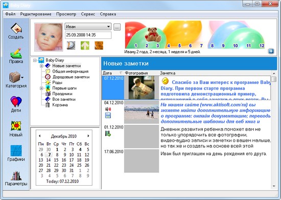 Почти для всех родителей нет большей радости, чем наблюдать за своим чадом, видеть, как ребенок становится самостоятельным и как он делает первые шаги в этом взрослом мире. Пока маленький человечек бесхитростен и наивен, он делает много смешных и забавных поступков. Со временем все эти позитивные моменты стираются из памяти, оставляя отпечатки наиболее ярких моментов на фотографиях, видео и в личных записях. Утилита Baby Diary дает возможность собрать воедино всю информацию о вашем ребенке. Программа, как нетрудно догадаться по названию, сконфигурирована для удобного ведения «оффлайнового ЖЖ», посвященного малышу. Дневник по умолчанию уже содержит массу категорий для систематизации всей информации о ребенке и семейных заботах - роды, первые шаги, праздники и так далее. В Baby Diary можно использовать функцию построения графиков, что очень важно, если вы следите за физическим развитием своего малыша. Делая регулярные замеры, например, веса ребенка, спустя некоторое время можно будет просмотреть графическую зависимость и сделать вывод, с какой скоростью был набран вес. При необходимости графики можно вывести на печать, чтобы показать их педиатру. Диаграммы можно масштабировать, а измеряемые параметры - придумывать самому. ![]() На страницах этого дневника можно размещать видео, публиковать фотографии, кроме этого, в программе можно использовать голосовые комментарии. Собранные в программе изображения можно просматривать в режиме слайд-шоу. Поддерживается огромное число мультимедийных форматов: JPG, GIF, WMF, EMF, TIFF, PCD, PNG, EPS, PSD, PDD, TGA, VST, ICB, VDA, WIN, PSP, PCX, PCC, SCR, PPM, PGM, PBM, CEL, PIC, BW, RGB, RGBA, SGI, CUT, RLA, RPF, AVI, MPG и другие. В Baby Diary имеется возможность использования специальной линейки, на которой автоматически будет показываться возраст вашего сына или дочки. Если роды еще только впереди, такой счетчик может показывать не возраст ребенка, а недели беременности. Утилита поддерживает многопрофильный режим, который позволяет вести дневники для нескольких детей одновременно. На основе готового шаблона из собранных родительских записей можно экспортировать информацию в готовый блог (в программе эта функция называется web-книга), посвященный ребенку. Для программы данного рода очень важно, что Baby Diary имеет русский интерфейс – все предельно понятно, а что непонятно, можно прояснить в русскоязычной документации. ⇡#MiLife 1.4