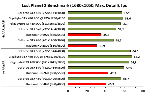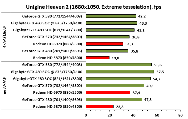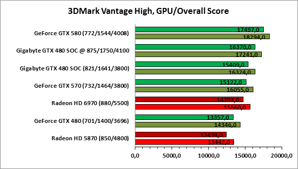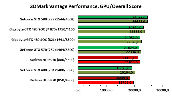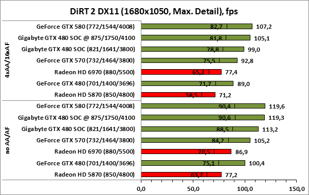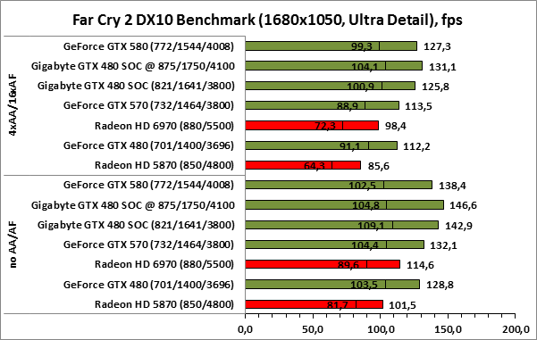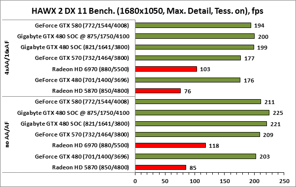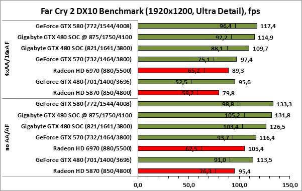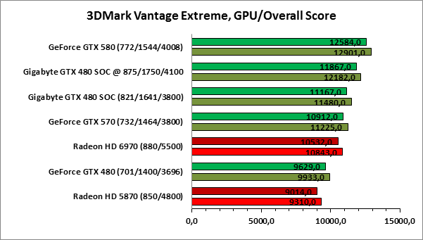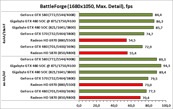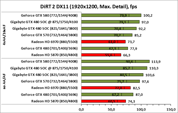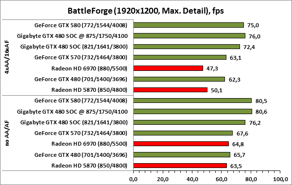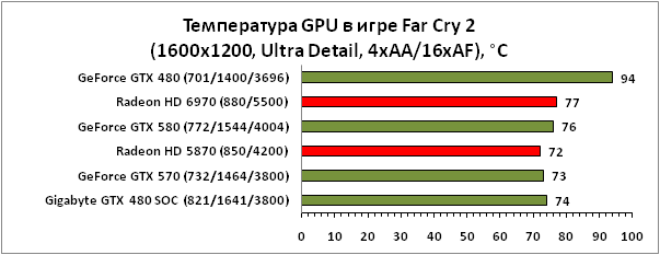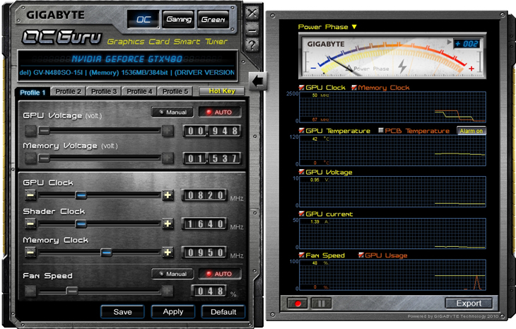 ⇡#РазгонЦенность лучших оверклокерских продуктов заключается не только в качественной аппаратной составляющей, но и в мощной программной поддержке. С точки зрения “железа” ускоритель Gigabyte GeForce GTX 480 SOC смотрится весьма неплохо, по крайней мере, теоретически, а что же с программной частью? Здесь, как оказалось, тоже полный порядок. Аналогично компании MSI, которая активно продвигает специальную оверклокерскую утилиту Afterburner, специалисты Gigabyte разработали схожий по своим возможностям программный продукт – Gigabyte OC Guru. ![]() OC Guru позволяет осуществлять полный контроль надо частотами и напряжениями компонентов графического ускорителя, а также мониторинг всех его важнейших параметров. Внешне программа сильно напоминает уже известную нам утилиту MSI Afterburner, так что за удобство переживать не стоит. Все элементы управления расположены под рукой, можно даже сказать – привычно. Однако утилита OC Guru, в отличие от продукта конкурента, не работает с ускорителями производства других компаний. Такой шаг вряд ли положительным образом скажется на популярности Gigabyte OC Guru, а жаль. Как и ожидалось, разгон Gigabyte GeForce GTX 480 Super Overclock не вызвал затруднений. Для разгона ускорителя мы не прибегали к повышению напряжения на графическом ядре или видеопамяти. Максимально стабильная частотная формула для нашего экземпляра GTX 480 SOC составила 875/1750/4100 МГц для графического ядра, шейдерного домена и видеопамяти, соответственно. ⇡#Температура и энергопотребление![]() ![]() В сравнении с эталонным образцом GeForce GTX 480, новинка Gigabyte выглядит более чем достойно. Несмотря на существенный рост тактовых частот, графический процессор ускорителя GTX 480 SOC разогревается заметно слабее своего эталонного собрата. Очевидно, что использование системы охлаждения Windforce 3X оправдано на все 100%. ![]() ![]() Как показало наше тестирование, благодаря оптимизации системы питания, а также специальному отбору чипов для производства видеокарт серии SOC, инженерам Gigabyte удалось добиться от GeForce GTX 480 SOC энергопотребления, сопоставимого с эталонным вариантом GTX 480, и это при том, что эталон работает на более низких тактовых частотах. Хотя, конечно, тестовый стенд с установленными одночиповыми топ-моделями конкурента по-прежнему потребляет значительно меньше энергии, да и новые ускорители GTX 570/580 могут похвастать меньшим аппетитом. ![]() ![]() ![]() Несмотря на существенный рост тактовых частот, ускоритель Gigabyte GeForce GTX 480 SOC не в силах противостоять мощи GeForce GTX 580, причём даже после дополнительного разгона GPU и видеопамяти. А вот ускоритель GTX 570 показал более скромные результаты, нежели продукт Gigabyte, что, впрочем, ожидаемо. Посмотрим, сможет ли разогнанная Gigabyte GeForce GTX 480 SOC составить достойную конкуренцию GeForce GTX 580 в реальных игровых приложениях. ![]() ![]() В Battleforge ускоритель Gigabyte GTX 480 SOC выглядит достаточно уверенно. В разрешении 1680x1050, благодаря высоким тактовым частотам, продукт Gigabyte немного опережает неразогнанный GeForce GTX 580. При переходе к более высокому разрешению наоборот, GeForce GTX 580 оказывается немного быстрее GeForce GTX 480 SOC от Gigabyte, правда, ручная доводка частот последнего исправляет и этот “недостаток”. ![]() ![]() А вот в DiRT 2, вне зависимости от используемого разрешения, ускоритель Gigabyte GeForce GTX 480 SOC не может составить конкуренцию более продвинутому соратнику в лице GeForce GTX 580. Очевидно, что архитектурные изменения, внесённые в GF1