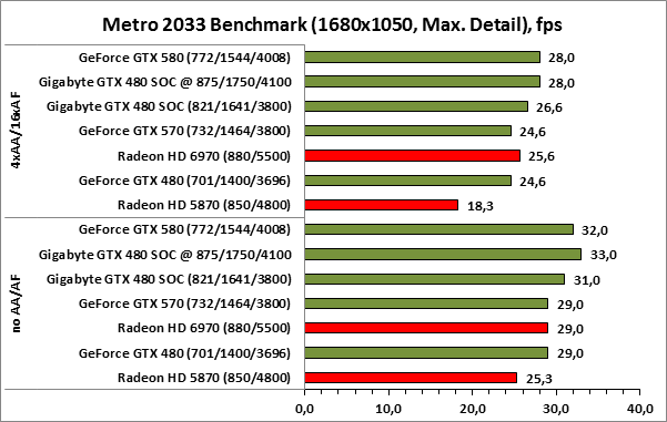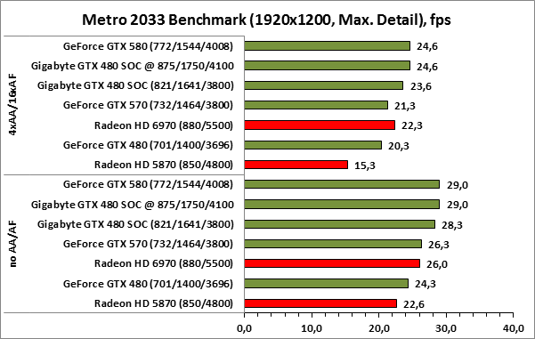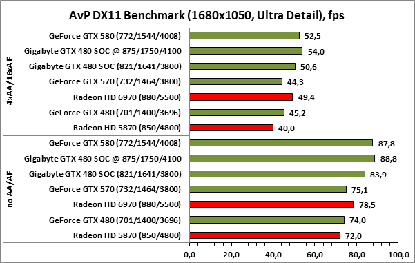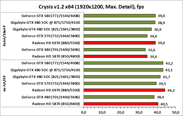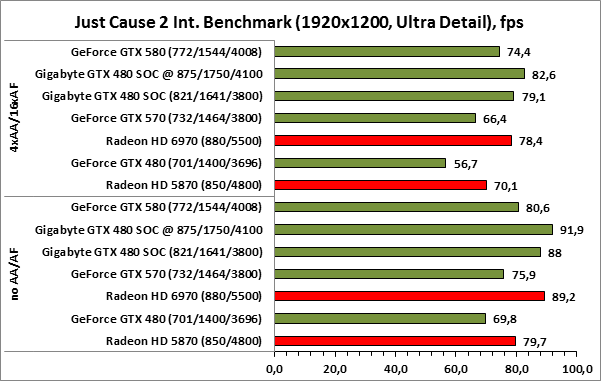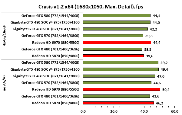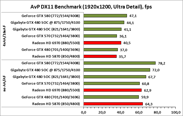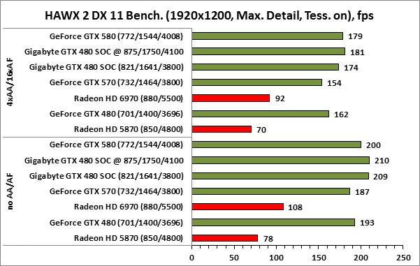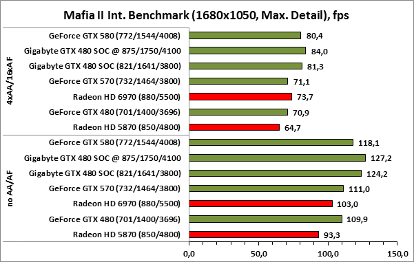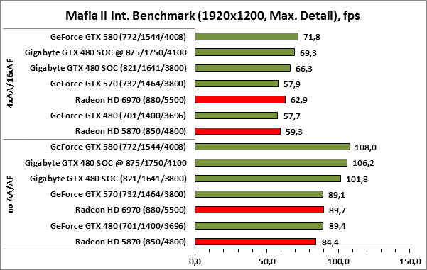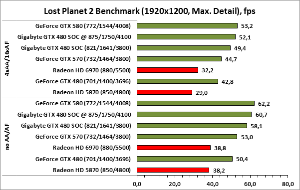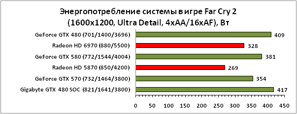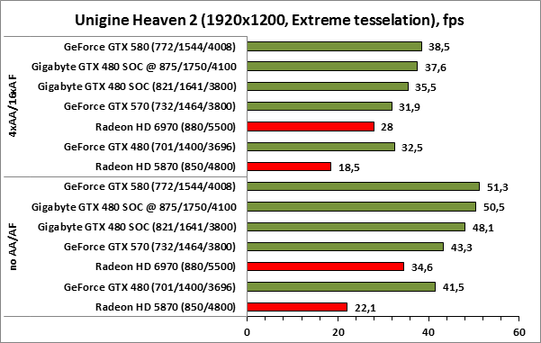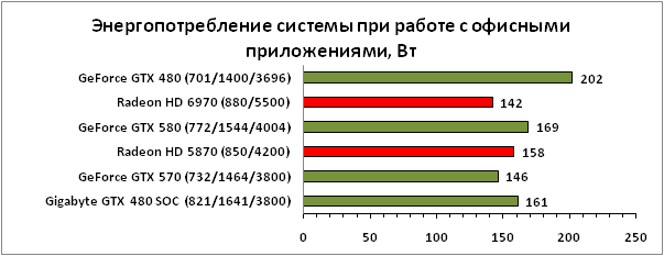 ⇡#РазгонЦенность лучших оверклокерских продуктов заключается не только в качественной аппаратной составляющей, но и в мощной программной поддержке. С точки зрения “железа” ускоритель Gigabyte GeForce GTX 480 SOC смотрится весьма неплохо, по крайней мере, теоретически, а что же с программной частью? Здесь, как оказалось, тоже полный порядок. Аналогично компании MSI, которая активно продвигает специальную оверклокерскую утилиту Afterburner, специалисты Gigabyte разработали схожий по своим возможностям программный продукт – Gigabyte OC Guru. ![]() OC Guru позволяет осуществлять полный контроль надо частотами и напряжениями компонентов графического ускорителя, а также мониторинг всех его важнейших параметров. Внешне программа сильно напоминает уже известную нам утилиту MSI Afterburner, так что за удобство переживать не стоит. Все элементы управления расположены под рукой, можно даже сказать – привычно. Однако утилита OC Guru, в отличие от продукта конкурента, не работает с ускорителями производства других компаний. Такой шаг вряд ли положительным образом скажется на популярности Gigabyte OC Guru, а жаль. Как и ожидалось, разгон Gigabyte GeForce GTX 480 Super Overclock не вызвал затруднений. Для разгона ускорителя мы не прибегали к повышению напряжения на графическом ядре или видеопамяти. Максимально стабильная частотная формула для нашего экземпляра GTX 480 SOC составила 875/1750/4100 МГц для графического ядра, шейдерного домена и видеопамяти, соответственно. ⇡#Температура и энергопотребление![]() ![]() В сравнении с эталонным образцом GeForce GTX 480, новинка Gigabyte выглядит более чем достойно. Несмотря на существенный рост тактовых частот, графический процессор ускорителя GTX 480 SOC разогревается заметно слабее своего эталонного собрата. Очевидно, что использование системы охлаждения Windforce 3X оправдано на все 100%. ![]() ![]() Как показало наше тестирование, благодаря оптимизации системы питания, а также специальному отбору чипов для производства видеокарт серии SOC, инженерам Gigabyte удалось добиться от GeForce GTX 480 SOC энергопотребления, сопоставимого с эталонным вариантом GTX 480, и это при том, что эталон работает на более низких тактовых частотах. Хотя, конечно, тестовый стенд с установленными одночиповыми топ-моделями конкурента по-прежнему потребляет значительно меньше энергии, да и новые ускорители GTX 570/580 могут похвастать меньшим аппетитом. ![]() ![]() ![]() Несмотря на существенный рост тактовых частот, ускоритель Gigabyte GeForce GTX 480 SOC не в силах противостоять мощи GeForce GTX 580, причём даже после дополнительного разгона GPU и видеопамяти. А вот ускоритель GTX 570 показал более скромные результаты, нежели продукт Gigabyte, что, впрочем, ожидаемо. Посмотрим, сможет ли разогнанная Gigabyte GeForce GTX 480 SOC составить достойную конкуренцию GeForce GTX 580 в реальных игровых приложениях. ![]() ![]() В Battleforge ускоритель Gigabyte GTX 480 SOC выглядит достаточно уверенно. В разрешении 1680x1050, благодаря высоким тактовым частотам, продукт Gigabyte немного опережает неразогнанный GeForce GTX 580. При переходе к более высокому разрешению наоборот, GeForce GTX 580 оказывается немного быстрее GeForce GTX 480 SOC от Gigabyte, правда, ручная доводка частот последнего исправляет и этот “недостаток”. ![]() ![]() А вот в DiRT 2, вне зависимости от используемого разрешения, ускоритель Gigabyte GeForce GTX 480 SOC не может составить конкуренцию более продвинутому соратнику в лице GeForce GTX 580. Очевидно, что архитектурные изменения, внесённые в GF1