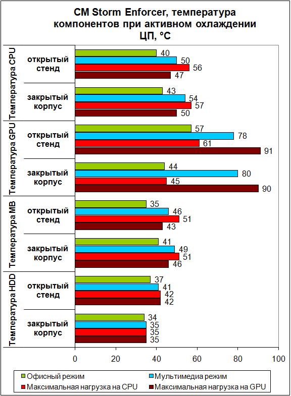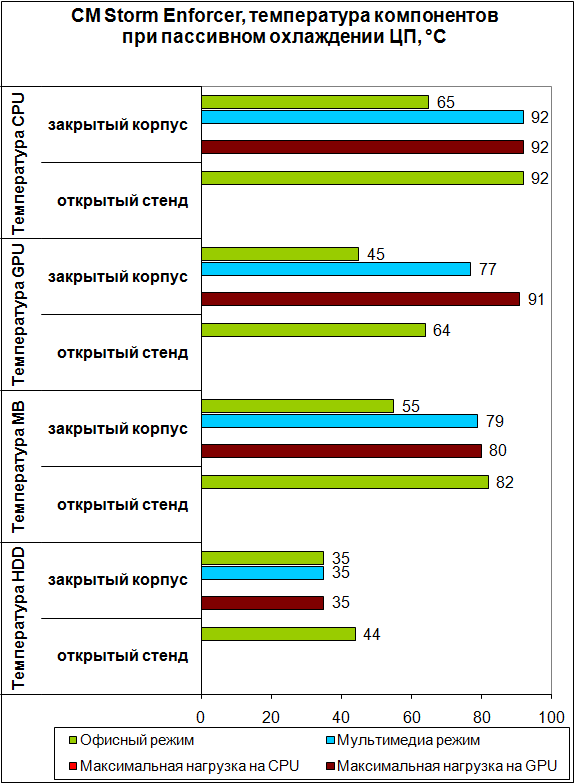 ![]() В режиме активного охлаждения радиатора процессора картина весьма неоднозначная. С одной стороны, видеокарте и жесткому диску в корпусе куда комфортнее, чем на открытом стенде, с другой — процессору и материнской плате Enforcer создал менее благоприятные условия. Стоит сказать, что хоть разница не столь велика, но заметна — в некоторых режимах системная плата оказалась горячее на 5 градусов относительно аналогичного показателя при работе вне корпуса, а процессор — всего на 3-4 в зависимости от режима работы. Посмотрим, что же изменится в режиме пассивного охлаждения. ![]() Конечно, система сохранила свою работоспособность, однако от режима максимальной нагрузки на ЦП пришлось отказаться — слишком уж велики температуры даже в менее экстремальных условиях. При пассивном охлаждении процессора недостаточный отток горячего воздуха становится более заметным, дополнительный вытяжной вентилятор на верхней панели был бы не лишним. Однако видеокарта и жесткий диск, обдуваемые фронтальным вентилятором, чувствуют себя вполне комфортно, разница в температурах по сравнению с режимом активного охлаждения невелика. ⇡#ВыводыБезусловно, современный игровой корпус, внутреннее пространство которого может быть перепланировано в зависимости от потребностей пользователя, а агрессивный дизайн позволит достойно выглядеть на LAN-party, по цене в 90 евро станет поистине привлекательным выбором для сборки игровой системы. Конечно, не обошлось и без недостатков, среди которых невысокая эффективность штатной системы охлаждения. Однако это не омрачает общего приятного впечатления, создаваемого корпусом.