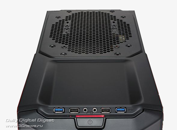 Внутреннее строение. Сборка системы Внутри корпуса довольно просторно: вместе с материнской платой формата micro ATX или ATX можно разместить до четырех 5,25-дюймовых устройств, одно из которых может быть заменено 3,5-дюймовым с выводом на переднюю панель, например устройством для карт памяти. Также в Enforcer найдется место для шести жестких дисков стандартного размера. Помимо этого, можно установить и SSD–накопитель, для которого предусмотрена отдельная съемная корзина небольших размеров. Системная плата крепится на стандартные латунные стойки винтами из комплекта. Проблем здесь возникнуть не должно. Вырез в поддоне материнской платы позволит без труда заменить систему охлаждения процессора без снятия системной платы. Высота радиатора процессора не слишком критична для Enforcer: после установки стендового Titan Fenrir остался запас около трех сантиметров. Модуль питания ставится довольно легко, стандартному Glacial Power места хватило с избытком. При использовании более габаритного блока питания можно демонтировать корзину для 2,5-дюймовых накопителей. Кабели питания без труда прокладываются за поддоном материнской платы благодаря многочисленным вырезам. На первый взгляд, места под видеокарту не так уж много — 27 сантиметров. Этого оказалось достаточно для используемого нами при тестировании ускорителя AMD Radeon HD 6970, но расстояние от торца карты до корзины жестких дисков едва превышает 10 миллиметров. Однако при использовании более габаритной видеокарты можно снять часть корзины для жестких дисков, в этом случае под карты расширения высвободится около 39 сантиметров, чего с лихвой хватит для любого видеоускорителя. Для установки накопителей информации используются салазки из комплекта. Все довольно просто и удобно — крепим на диск пару салазок и вставляем его по направляющим в корзину. Теперь пришло время поговорить о системе охлаждения. По умолчанию она представлена двумя вентиляторами. На передней панели установлен 200-мм вентилятор с красной подсветкой, работающий на вдув, скорость его вращения при питании 12 вольт составляет 1000 оборотов в минуту. Другой вентилятор располагается на задней панели, это самая обычная «стодвадцатка», работающая на выдув. ⇡#Тестирование. ВыводыТеперь проверим эту систему охлаждения в работе.