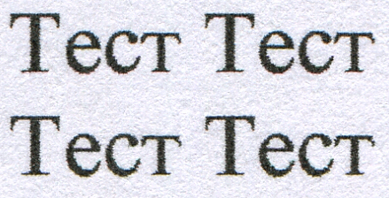 Скорость печати текста была измерена только при использовании нижнего лотка для бумаги (кассеты), ведь офисная бумага обычно устанавливается именно в этот лоток, что позволяет впоследствии работать со специальными носителями, не вынимая обычную бумагу. Для проверки было распечатано 10 листов текстового шаблона, полностью заполненного словом «Тест» (шрифт — Times New Roman, кегль — 12, межстрочный интервал — стандартный). В быстром режиме печати при полном заполнении страницы словом «Тест» среднее время печати страницы без учёта времени подготовки к печати составило 5,0 секунды. При частичном заполнении в 20, 15 и 10 строчек среднее время печати одной страницы составило 2,7, 2,5 и 2,0 секунды соответственно. При печати в стандартном режиме при полностью заполненной странице в среднем потребовалось 5,9 секунды, а при частичном — 2,7, 2,5 и 2,2 секунды соответственно. Качество печати текста в нормальном и быстром режимах мало различается (учитывая мизерный разрыв в скорости печати, это и не удивительно), но в первом режиме изображение чуть светлее из-за меньшего расхода чернил, поэтому быстрый режим скорее стоило назвать экономичным. Ниже приведены кроп-фрагменты печати в режимах «быстро» и «стандарт» на обычной офисной бумаге плотностью 80 г/м2.