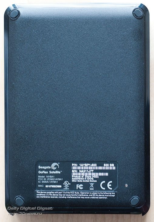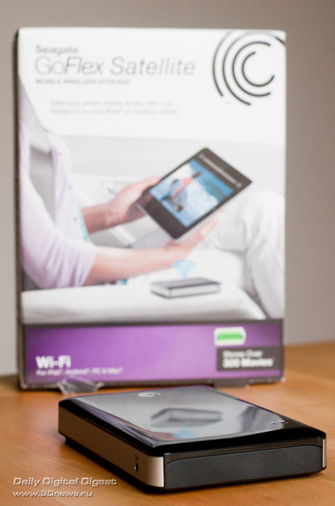 «Не вопрос!» — откликнулись в Seagate и придумали следующий выход из ситуации: берем обычный 2,5-дюймовый жесткий диск (в данный момет это Momentus ST9500325ASG емкостью 500 Гбайт, но в будущем наверняка появятся и более емкие версии), добавляем к нему датчик падения, управляющий аварийной парковкой головок, модуль WiFi, и облачаем его в прочную и красивую коробочку. К ней в комплект кладем компактный блок питания и переходник, позволяющий подключать все это хозяйство к USB 3.0 и копировать туда фильмы, музыку и фотографии. Переходники на eSATA и FireWire 800 в комплект не кладем, а продаем отдельно — чем зарабатываем «дикие тыщи» денег. Полученное устройство называем Seagate GoFlex Satellite.