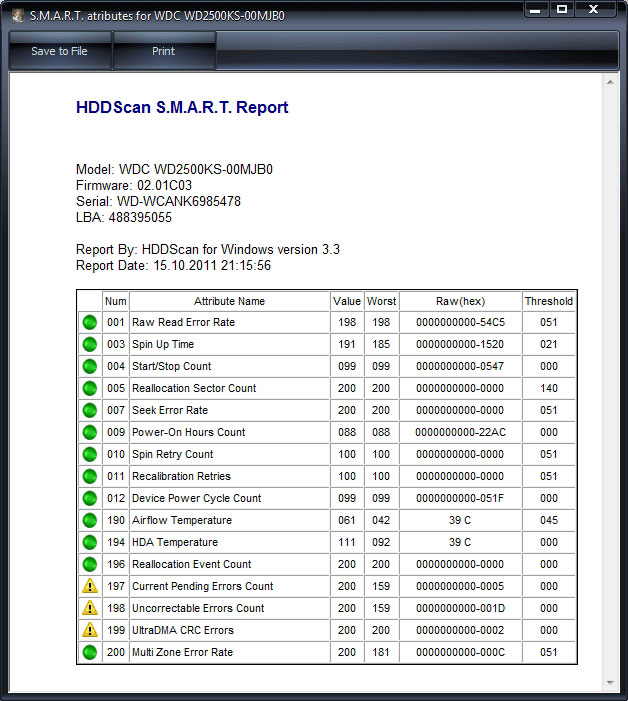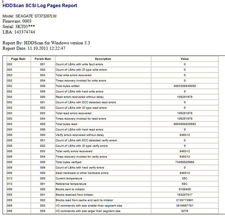 Как видим, большинство «интересных» атрибутов отражает функционирование механики накопителя. Технология SMART действительно позволяет предсказывать выход диска из строя в результате механических неисправностей, что, по статистике, составляет около 60% всех отказов. Полезен и мониторинг температур: перегрев головок резко ускоряет их деградацию, так что превышение опасного порога (45-55º в зависимости от модели) — сигнал срочно улучшить охлаждение диска. Вместе с тем не следует переоценивать возможности SMART. Современные диски нередко «дохнут» на фоне отличных атрибутов, что связано с тонкими процессами дефект-менеджмента в условиях высокой плотности записи и не всегда, мягко говоря, качественных компонентов (разнобой в отдаче головок сегодня — обычное дело). Тем более SMART не способен предсказать последствия таких «форс-мажоров», как скачок напряжения, перегрев платы электроники или повреждение накопителя от удара. Практически у всех атрибутов наибольший интерес представляет поле Raw Value: «сырые» значения наиболее информативны. Их нормировка (степень приближения к абстрактному порогу) часто ничего не дает и только запутывает дело. Поэтому и программы, полагающиеся на эти проценты, нельзя считать вполне надежными. Типичный случай для них — ложные тревоги. Программа сообщает, что новый, недавно установленный накопитель того и гляди «склеит ласты». А все дело в том, что в начале эксплуатации некоторые атрибуты SMART быстро меняются и примитивная экстраполяция приводит к пугающим пользователя прогнозам. Я советую бесплатную программу HDDScan — она корректно понимает все атрибуты, в том числе и новые, правильно разбирает температурные показатели. Отчет выводится в виде аккуратной xml-таблицы с цветовой индикацией, которую можно сохранить или распечатать. ![]() SMART диска WD пятилетнего возраста. О его близкой кончине свидетельствуют ненулевые значения атрибутов 1 и 200 (для WD они особенно чреваты), а также тот факт, что после ремапа атрибут 197 снова растет. Это значит, что возможности исправления дефектов исчерпаны Крайне полезна у HDDScan возможность считывать SMART у внешних накопителей, столь распространенных сегодня. Практически ни одна другая программа этого не умеет, ведь на пути данных стоит контроллер, преобразующий интерфейс PATA/SATA в USB или FireWire. Автор целенаправленно работал в этом направлении, и ему удалось охватить широкий спектр контроллеров. Не забыты и диски с интерфейсом SCSI, до сих пор широко применяемые в серверах (атрибуты у них особые — например, выводится общее число записанных или считанных байтов за всю жизнь накопителя). Функционал HDDScan полностью отвечает потребностям ремонтника. Когда первичную диагностику принесенного внешнего диска можно провести, не разбирая корпус, — это удобно, экономит время, а порой и сохраняет гарантию. ![]() SMART, снятый со SCSI-диска. Здесь исторически сложились совсем другие атрибуты ⇡#Барьеры HDDМеханика давно стала ахиллесовой пятой HDD, и даже не столько из-за чувствительности к ударам и вибрации (это еще можно компенсировать), сколько из-за медлительности. Самые быстрые «дерганья» блоком магнитных головок (2-3 мс у лучших серверных моделей) в тысячи раз уступают скоростям электроники. И принципиально ничего тут не улучшишь. Поднимать скорость вращения пакета дисков некуда, 15000 об./мин уже предел. Япо