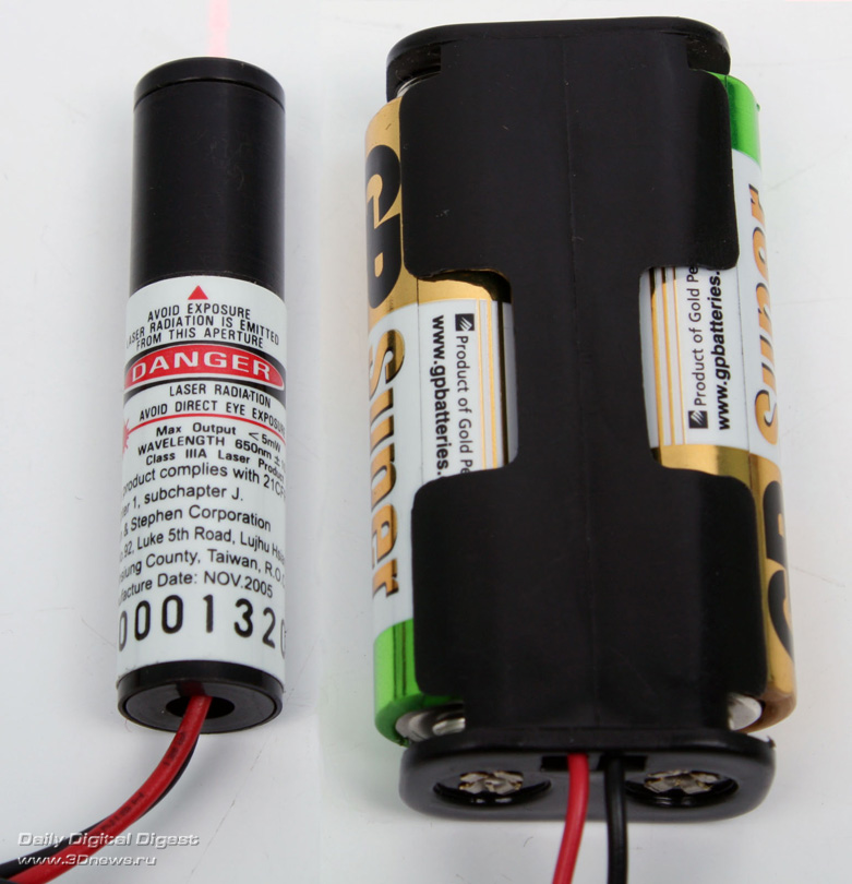 Внимание!!! Лазерное излучение очень опасно! Никогда не направляйте лазерный луч в глаза людям (в том числе себе) и животным — это может нанести непоправимый вред зрению (например, вызвать ожог сетчатки глаза)! Запрещается смотреть на лазерный луч через любые оптические приборы! Не направляйте лазерный луч на любые транспортные средства (в том числе самолёты)! Никогда не давайте лазер детям или неадекватным людям, а также позаботьтесь о том, чтобы они не смогли получить доступ к лазеру! Не используйте лазерные модули мощностью более 5 мВт, так как в этом случае опасность может представлять даже отражённый луч! В любом случае настоятельно рекомендуется приобрести для работы специальные защитные очки, рассчитанные на ту длину волны, которую излучает лазерный модуль! Не держите лазерный модуль на уровне головы! Всегда соблюдайте меры безопасности! Если вам непонятен смысл вышесказанного, не используйте лазер! Редакция 3DNews и автор не несут никакой ответственности за любые возможные последствия, в том числе за травмы, причиненные лазерным излучением!