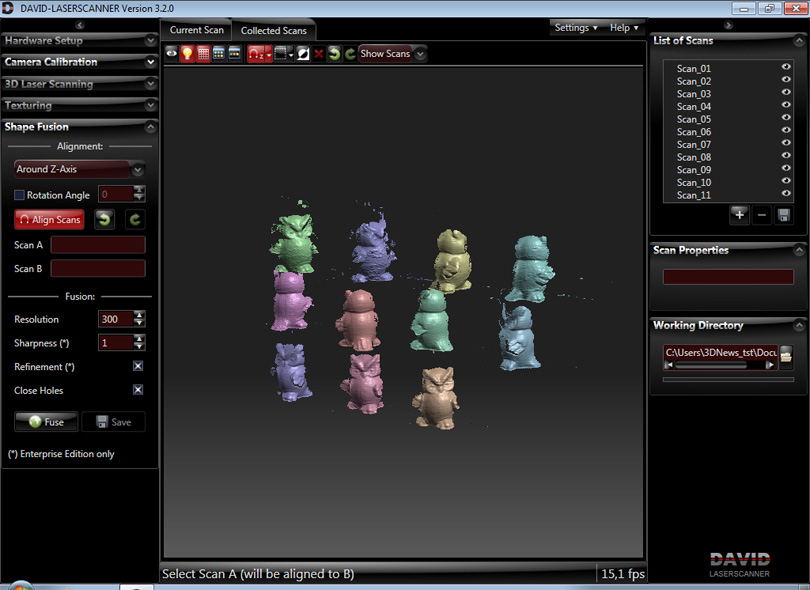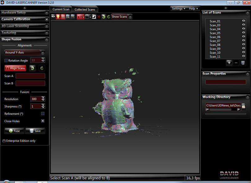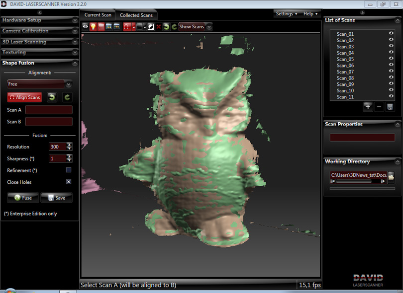 Процесс текстурирования оставим для самостоятельного изучения и перейдём к сшиванию, за которое отвечает модуль Shape Fusion. Можно сделать это и вручную почти в любом трёхмерном редакторе. DAVID-Laserscanner сохраняет сканы в открытом формате Alias Wavefront (*.obj), но в демоверсии специально занижает качество. У вас уже должен быть готовый список с отсканированными элементами. Нам надо выровнять их между собой. Выбираем тип выравнивания в списке. Если вы «крутили» объект вокруг одной оси, то выберите её. Ну а если ещё и поворачивали на строго определённый угол, укажите и его. Затем нажмите Align Scans и выберите в списке два соседних скана. Программа ненадолго «задумается» и постарается выровнять их между собой в паре-тройке вариантов. Выберите наиболее точный кнопками с закруглёнными стрелочками в верхней части окна.