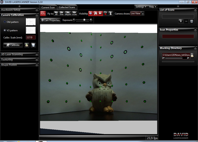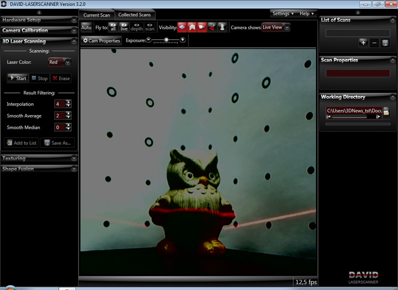 Как только камера и угол будут установлены, можно приступать к калибровке. Запустите DAVID-Laserscanner, выберите в качестве источника видеосигнала вашу веб-камеру, а также установите режим её работы (разрешение и частоту кадров). Теперь перейдите к разделу Camera Calibration. Введите заранее измеренную ширину Scale и нажмите Calibrate. Если программа сразу выдала, что калибровка прошла успешно, то это очень здорово. В противном случае придётся играться с настройками камеры. Отключите различные «улучшалки» изображения, уберите автоматическую подстройку яркости и контраста, а также следящий автофокус. Если есть ручная фокусировка, то сделайте изображение круглых меток более чётким. Также придётся подобрать расстояние от угла до объектива и наклон камеры. Процесс калибровки может надолго затянуться, но, как только он завершится, сразу же аккуратно закрепите камеру и калибровочный угол и больше не трогайте их.