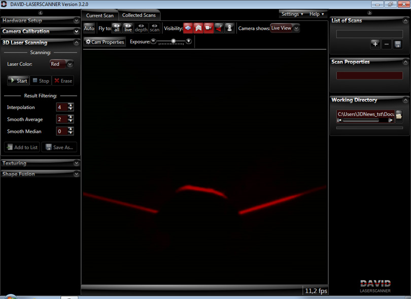 Теперь надо затенить помещение (выключить источники света, зашторить окна). Ещё раз наведите лазер на образец. В это время на экране в идеальном случае вы должны увидеть только красную линию на чёрном фоне. Если это не так, то придётся ещё раз открыть настройки веб-камеры и поменять их. Но для начала стоит подвигать ползунок значения экспозиции (Exposure) влево-вправо. Ах да, не забудьте выбрать цвет лазерного излучения вашего модуля. Как только всё будет готово, можно приступать к пробному сканированию.
