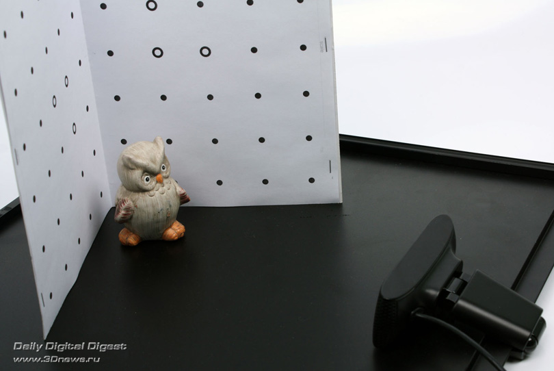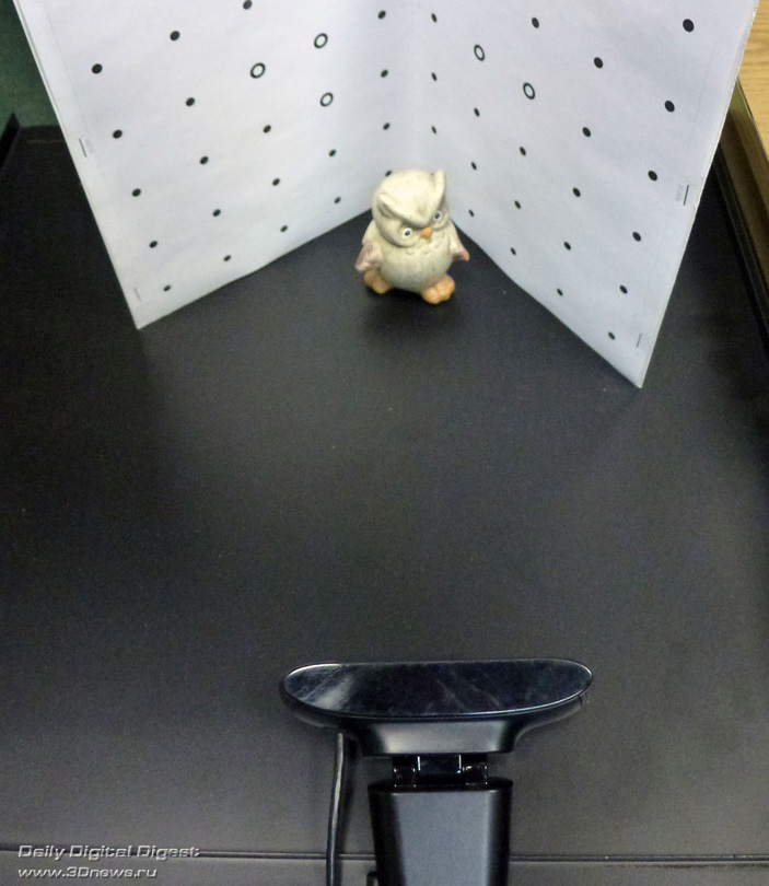 Главное условие — угол между двумя плоскостями должен составлять 90 градусов и не меняться. Также надо следить за тем, чтобы распечатанные листы оставались гладкими и ровными, а на их поверхности не было ничего глянцевого. Разработчики, в частности, рекомендуют крепить распечатанные листы с помощью пластыря. Также важно не перепутать ориентацию листов. На распечатке надо измерить и запомнить длину (в мм) линии, подписанной Scale. В качестве примера мы будем сканировать небольшую фигурку совы. В этом случае подошёл шаблон формата А4, который был прикреплён к куску картонной папки с помощью степлера.