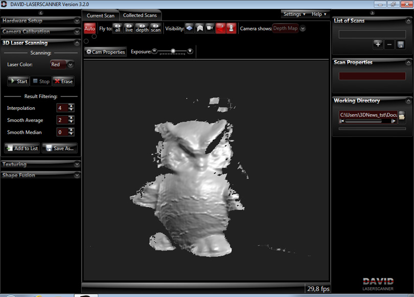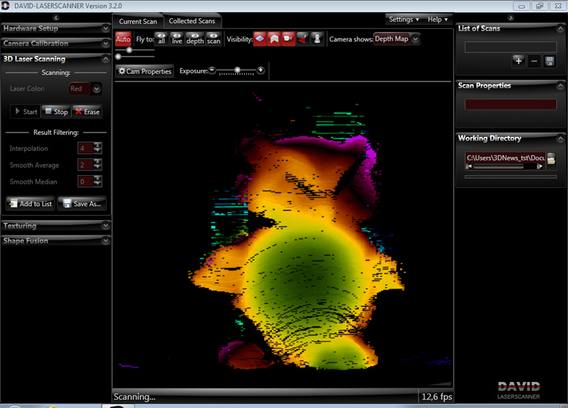 Переключите режим отображения на карту глубины (Camera Shows -> Depth Map). Аккуратно переместите лазерный луч в поле зрения веб-камеры. Луч должен быть по возможности горизонтальным, как можно более тонким, а сам модуль надо держать выше камеры. Поводите лучом вверх-вниз вдоль сканируемого объекта — и вы увидите, как программа с небольшой задержкой отрисовывает на экране его контуры в пространстве. Нельзя водить лучом слишком быстро, но и от слишком медленного перемещения толку не будет. Старайтесь «закрасить» образец как можно более плотной сеткой линий. Также надо добиться того, чтобы не было «грязи» — лишних линий вокруг объекта. Лучше всего держать лазерный модуль в руке и при этом двигать его только кистью. В конце надо будет аккуратно вывести линию луча за пределы калибровочного угла.