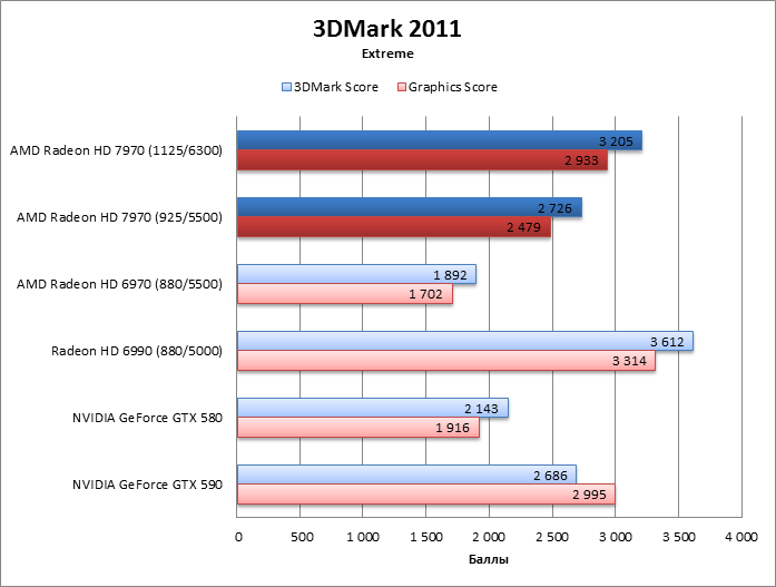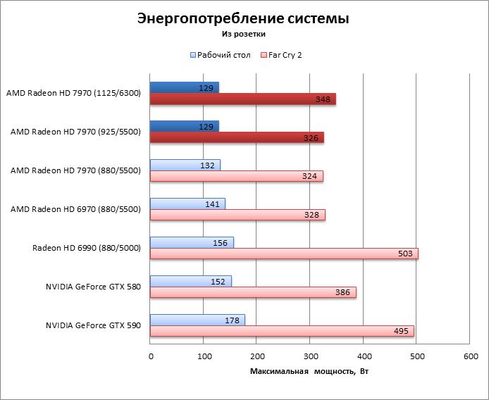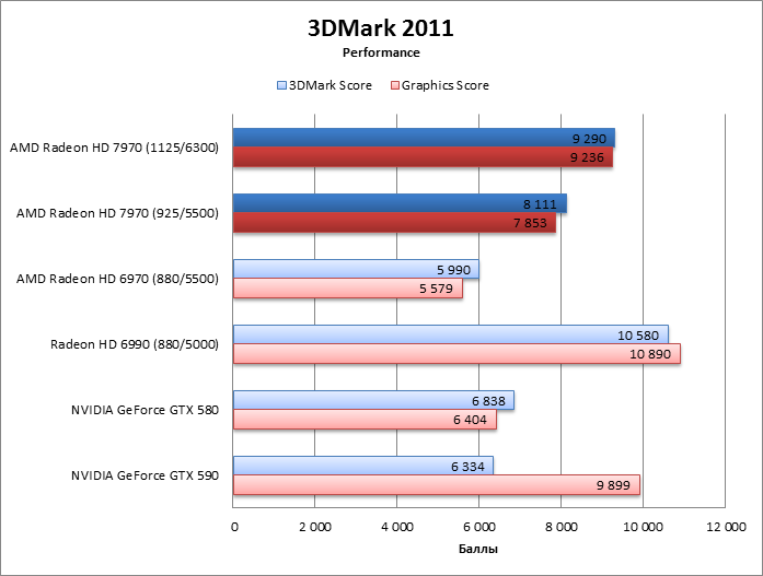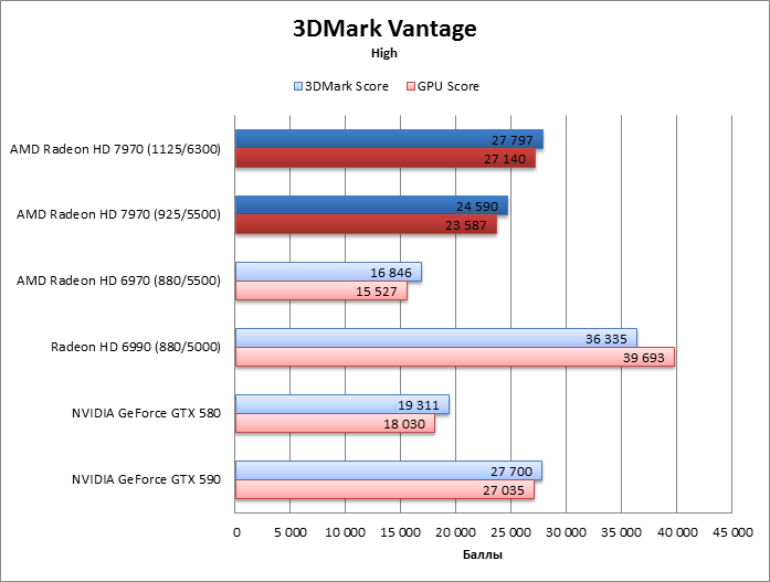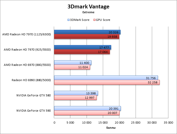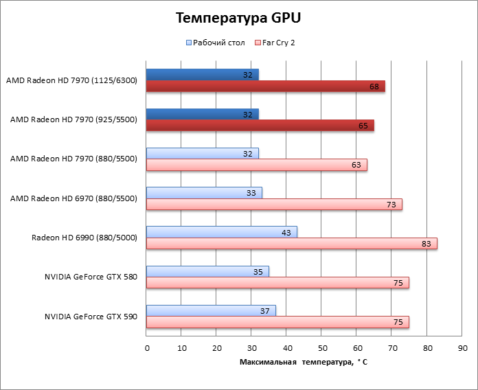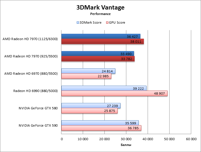 ⇡#Разгон, температура, энергопотреблениеAMD пообещала, что процессор HD 7970 без проблем разгонится до 1 ГГц и выше, во что легко можно поверить, так как 75 МГц при новом техпроцессе – не столь уж большое достижение. Но наш тестовый экземпляр легко прибавил 200 МГц (!) сверх штатной частоты GPU, а память разогналась с 5500 до 6300 эффективных МГц, и все это без подъема напряжения. Дальнейший разгон уперся в ограничения функции Overdrive, и преодолеть их при помощи известных трюков с ключами реестра и сторонних оверклокерских утилит не удалось. HD 7970 даже не позволяет считать BIOS с помощью существующего ПО, поэтому настоящие рекорды еще впереди. Похоже, что Radeon HD 7970 действительно не отличается от HD 6970 по TDP. Потребляемая мощность системы под нагрузкой точно такая же, а в режиме 2D HD 6970 даже более прожорлив. Оверклокинг немного прибавил к энергопотреблению, но результат все равно гораздо меньше, чем у прочих конкурентов – «двухголового» HD 6990 и ускорителей GeForce. ![]() Кроме того, HD 7970 оказался самой холодной картой из всех участников тестирования. Даже при максимальном разгоне он греется меньше, чем HD 6970. А так как потребляемая мощность у карт одинакова, то стоит сказать спасибо новой системе охлаждения. Эффект особенно выражен, если опустить частоту процессора HD 7970 до уровня HD 6970. ![]() ⇡#Производительность, синтетические тесты3DMark Vantage