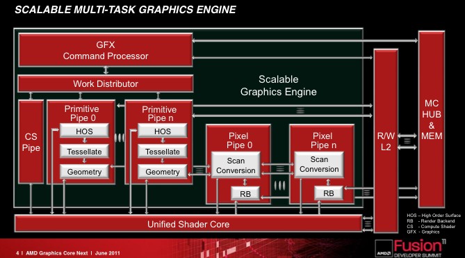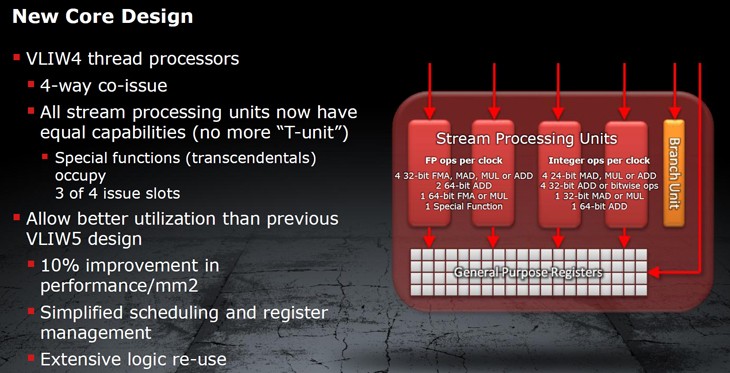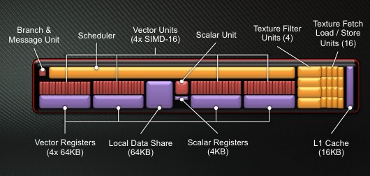 ⇡#ВведениеАрхитектура графических процессоров AMD (ATI) не подвергалась существенным изменениям со времен серии Radeon HD 2000: вплоть до HD 6000 в GPU использовался VLIW-дизайн. Что это такое? Сначала вспомним, как работает центральный процессор в наших персоналках. Современные CPU – суперскалярные, то есть их вычислительные блоки могут выполнять несколько инструкций из одного потока одновременно. Но инструкции при этом должны быть независимыми друг от друга, поэтому процессор непрерывно проверяет, когда можно выполнять параллельные операции, а когда нужно подождать разрешения очередной зависимости. Кроме того, CPU занимается предсказанием ветвлений и может делать часть работы заранее (out-of-order). Оптимизация этих функций – сложная техническая задача, а схемы, на которых они построены, занимают добрую часть кристалла CPU. Но есть другой путь: задать порядок исполнения инструкций на этапе компиляции кода. Компилятор сам находит инструкции, которые можно выполнять одновременно, и формирует из них длинные составные конструкции. Отсюда и термин VLIW – very long instruction word. VLIW в общем случае показывает высокую эффективность, когда код содержит мало зависимостей, а ход программы предсказуем. Компилятор «знает» код от начала до конца и может задать исполнение определенных фрагментов с большим запасом по времени. Но планирование получается жестким, и в случае когда ход программы зависит от внешних данных, хитроумная компиляция уже мало помогает, исполнительные блоки простаивают и производительность идет вниз. Но рендеринг 3D-графики – предсказуемая задача и отлично распараллеливается. Поэтому ставка на VLIW, которую сделала тогда еще независимая канадская компания, себя полностью оправдала. Переложив функции планировщика на компилятор, ATI могла делать относительно компактные чипы с бешеными сотнями исполнительных элементов внутри, и видеокарты в результате получились относительно недорогими. Звездный час VLIW в исполнении AMD пришелся на время Radeon HD пятитысячной серии, когда дебют архитектуры Fermi от NVIDIA (GeForce 400) немного забуксовал. И неудивительно, ведь «зеленым» приходится делать огромные чипы, вплоть до трех миллиардов транзисторов. И даже сейчас, когда в адаптерах GeForce 500 архитектура Fermi уже работает на полную мощность, а топовые ускорители NVIDIA побеждают в бенчмарках продукцию AMD, шеститысячные Radeon все еще обеспечивают отличную производительность в играх. В таком случае, зачем AMD решилась на столь резкий поворот? Казалось бы, достаточно немного отполировать дизайн GPU, нарастить вычислительных блоков тут и там, внедрить более тонкий технологический процесс — и VLIW будет жить долго и счастливо. Зачем тратить время и деньги на разработку совершенно новой архитектуры? Но дело не только и не столько в играх. GPU медленно превращаются из устройств, предназначенных исключительно для 3D-рендеринга, в процессоры общего назначения (GPGPU – general purpose GPU), которые можно использовать для любых массированных параллельных вычислений. Однако на сегодняшний день вышло так, что если мы говорим GPGPU, то подразумеваем CUDA. Ни родной для «красных» API под названием ATI Stream, ни Open CL не имеют такой популярности, как CUDA от NVIDIA. Между тем AMD очень хочет откусить кусок от этого рынка, но чтобы это стало возможным, со старой доброй архитектурой VLIW придется расстаться. Для неграфических вычис