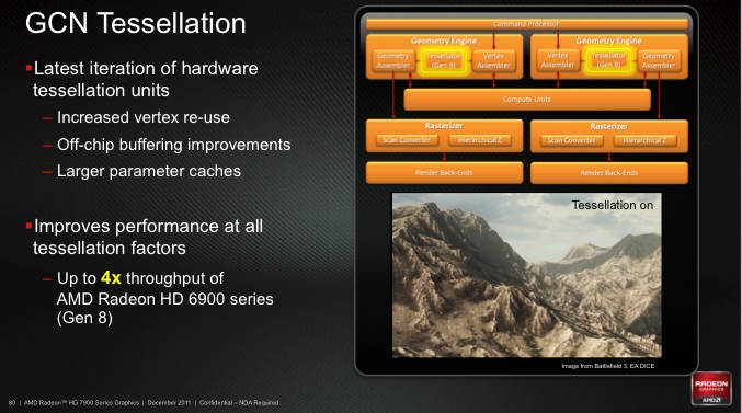 ![]() ![]() VLIW4 vs GCN Напоследок мы прогнали Radeon HD 7970 через игровые тесты на равных частотах с Radeon HD 6970. Диаграмма наглядно показывает, какое преимущество новая архитектура GCN дает сама по себе по сравнению c VLIW4. ![]() ⇡#ВыводыAMD с чистого листа создала GPU, которые радикально отличаются от всего, что было выпущено под маркой Radeon за последние несколько лет. По масштабу изменений событие сопоставимо с внедрением унифицированной шейдерной архитектуры VLIW5 в чипе R600 (Radeon HD 2900). Но если вы вспомните, какой нелегкий путь пришлось проделать VLIW5, прежде чем раскрылись заложенные в нее возможности, то станет заметно, что на этот раз все совсем по-другому. Архитектура GCN в лице чипа Tahiti уже сейчас представляет собой зрелый и чрезвычайно эффективный продукт. Radeon HD 7970 на 20-50% быстрее по сравнению с одночиповым флагманом AMD предыдущего поколения и легко справляется с основным конкурентом – GeForce GTX 580. При этом, несмотря на то что Tahiti – это огромный GPU доселе невиданной сложности, карта потребляет не больше энергии, чем HD 6970, и имеет высокий потолок для оверклокинга. А при разгоне производительность уже приближается к уровню двухпроцессорных адаптеров Radeon HD 6990 и GeForce GTX 590. Отметим, что позиции архитектуры Fermi все еще сильны в задачах с активным использованием возможностей DirectX 11. В некоторых играх GTX 580 лишь немного уступает новинке от AMD, так что у NVIDIA еще есть все шансы взять реванш в следующем году. Не менее интересно будет наблюдать, как AMD шаг за шагом сближает GPU с процессорами общего назначения. CUDA от NVIDIA получила большую фору за прошедшие годы, но теперь у AMD есть столь же мощная графическая архитектура, а еще – процессоры Fusion, которые рано или поздно тоже получат встроенные ядра GCN. ![]()