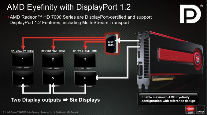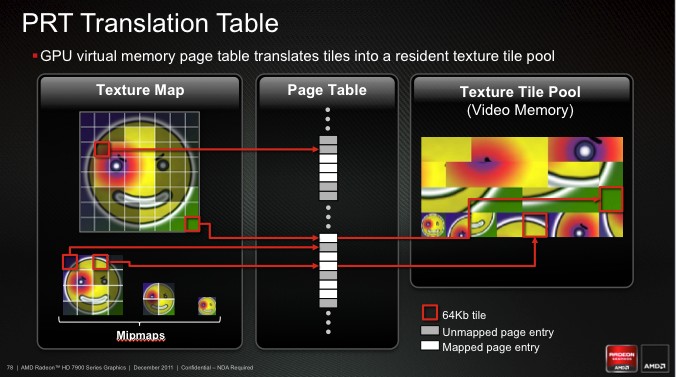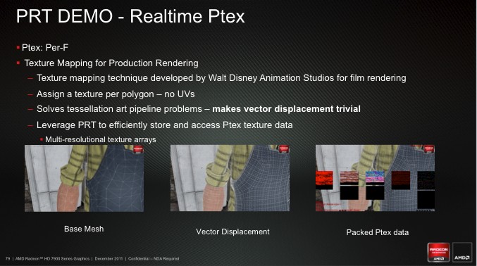 Новые Radeon поддерживают DisplayPort 1.2, а значит – технологию Multi-Stream. С ее помощью можно подключать к одному выходу три дисплея по цепочке или через специальный хаб. Причем на выходе хаба может быть не только DisplayPort, но и интерфейсы HDMI, DVI и VGA. AMD обещает, что хабы появятся в продаже летом 2012 года. ![]() HDMI-выход соответствует стандарту 1.4а, поэтому может передавать двойной сигнал на 3D-телевизор с частотой 24 кадра на каждый канал. А специально для игр есть поддержка 3 GHz HDMI с частотой 60 Гц на канал. Кроме того, стандарты DisplayPort 1.2 HBR 2 и 3 GHz HDMI пригодятся для подключения грядущих дисплеев с разрешением 4096x2160. ⇡#Radeon HD 7970⇡#Технические характеристикиHD 7970 – одночиповый флагман линейки, представляющий архитектуру GCN во всей мощи. Его GPU называется Tahiti и содержит 32 CU (Compute Units), устройство которых подробно описано выше. Если пересчитать это на количество отдельных ALU, как AMD делала до сих пор, то получится 2048 штук – в полтора раза больше, чем в ядре Cayman! И блоков TMU (texture mapping units) в Tahiti тоже 128 против 96. Шина памяти – 384-битная вместо 256-битной. Если учесть, сколько дополнительной логики добавили в архитектуру, то совершенно не удивительно, что Tahiti состоит из 4,31 миллиарда транзисторов. Просто для сравнения: в Cayman – 2,64 миллиарда, а в GF110 от NVIDIA – три. Работает все хозяйство на частоте 925 МГц. ![]() ![]() Однако чипы с архитектурой GCN печатают по техпроцессу 28 нм, так что по электрической мощности новинка удержалась в рамках HD 6970 – те же 250 Вт, да и сам кристалл не выглядит устрашающе. Карта комплектуется видеопамятью GDDR5 объемом 3 Гбайт. Массив набран микросхемами Hynix H5GQ2H24MFR со штатной частотой 1500 МГц (эффективная частота – 6 ГГц), но здесь они работают на частоте 1375 (5500) МГц. Рекомендованная цена HD 7970 составляет 549 долларов, что делает его самым дорогим одночиповым адаптером Radeon за всю их историю. ⇡#Внешний вид, конструкцияВ оформлении семитысячной серии AMD отступила от брутальных форм Radeon HD 6000 и выбрала броский дизайн с плавными линиями и глянцевой поверхностью кожуха. Вернулся узнаваемый красный текстолит, в этот раз – с малиновым оттенком. По габаритам Radeon HD 7970 не отличается от предшествующих одночиповых флагманов AMD/ATI. Продукция кирпичного завода AMD Карта тяжелая. Берешь в руку – и чувствуется мощь. Все дело в системе охлаждения с крупной испарительной камерой, приделанной к толстой раме. Со времен Radeon HD 6970 конструкция не претерпела больших изменений, разве что вентилятор-турбинка стал шире. Для лучшего охлаждения с заглушки убрали один порт DVI, чтобы целиком занять слот выхлопной решеткой. С задней стороны, как и раньше, есть прижимная крестовина. От сплошной крышки решили отказаться. На печатной плате, как и у HD 6970, есть переключатель между основным и резервным BIOS. А еще по задней поверхности разбросано несколько мелких сдвоенных переключателей неизвестного назначения, которые мы, от греха подальше, решили не трогать. Возможно, что перед нами лишь инженерный образец HD 7970 и на серийных платах этих странных элементов уже не будет. В хвосте платы расположены семь катушек индуктивности и восьмифазный контроллер напряжения CHiL CHL8228G, чему, без сомнения, будут рады оверклокеры, ведь он уже использовался на картах Radeon HD 6970, . Скорее всего, и схема питания карты организована по-старому: шесть фаз приходятся на GPU и одна отдана для питания внутренних цепей микросхем GDDR5. В противоположн