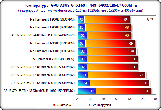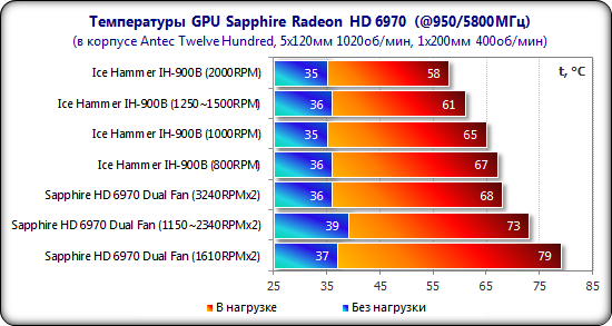 Измерение уровня шума систем охлаждения осуществлялось с помощью электронного шумомера CENTER-321 в период от одного до трёх часов ночи в полностью закрытой комнате площадью около 20 кв.м со стеклопакетами. Уровень шума измерялся вне корпуса системного блока, когда источником шума в комнате являлся только сам кулер и его вентилятор. Шумомер, зафиксированный на утяжелённом штативе с мягкими ножками, всегда располагался строго в одной точке на расстоянии ровно 150 мм от ротора вентилятора кулера. Системы охлаждения, установленные на видеокарты, размещались на самом углу стола на пенополиуретановой подложке. Нижняя граница измерений шумомера составляет 29,8 дБА, а субъективно комфортный (не путать с низким) уровень шума кулеров при измерениях с такого расстояния находится около отметки 36 дБА. Перейдём к изучению результатов тестирования. ⇡#ЭффективностьПосмотрим, как проявит себя Ice Hammer на слегка разогнанной Sapphire Radeon HD 6970: ![]() Очевидно, что в охлаждении графического процессора Ice Hammer IH-900B на голову выше конкурента в лице Sapphire Dual Fan. Шутка ли, но даже при скорости вентилятора 800 об/мин Ice Hammer на 1 градус Цельсия эффективнее оригинальной системы охлаждения Sapphire, функционирующей на максимальной мощности при 3240 об/мин двух её вентиляторов! В случае, когда Ice Hammer подключена непосредственно к видеокарте, скорость ее вентилятора в автоматическом режиме работы изменяется от 1250 до 1500 об/мин, при этом по эффективности новинка превосходит штатный кулер Sapphire сразу на 12 градусов Цельсия! Впечатляющий результат, нужно признать. А при максимальной скорости 120-мм вентилятора Ice Hammer пиковую температуру графического процессора удаётся снизить ещё на 3 градуса Цельсия относительно автоматического режима. Остаётся открытым вопрос охлаждения силовых элементов, но на Sapphire Radeon HD 6970 таких датчиков нет, поэтому что там с их температурами — не известно. Впрочем, если видеокарта при разгоне успешно и без дефектов изображения прошла все циклы тестирования, то можно предположить, что фатальных ухудшений в сравнении с Dual Fan не происходило. Теперь изучим эффективность новинки на прилично разогнанной ASUS GTX 560 Ti 448 cores DirectCU II, графический процессор которой оснащён теплораспределителем: ![]() Уверенно выглядит Ice Hammer IH-900B и на графическом процессоре с теплораспределителем, успешно справившись с охлаждением разогнанной видеокарты даже на минимальных 800 об/мин своего вентилятора. При этом ASUS DirectCU II способна продемонстрировать такую же эффективность только при скорости вентиляторов 2500 об/мин и выше, а уже при 2000 об/мин проигрывает Ice Hammer сразу 6 градусов Цельсия в пике нагрузки. Что касается разницы между этими системами охлаждения на максимальных скоростях, то она составляет всего 1 градус Цельсия, правда, уровень шума ASUS DirectCU II намного выше. К его оценке мы сейчас и перейдём. ⇡#Уровень шумаУровень шума Ice Hammer IH-900B мы сравнили с уровнем шума оригинальных систем охлаждения Sapphire и ASUS во всём диапазоне их работы. Вот что получилось: Казалось бы, уровень шума Ice Hammer IH-900B выше, ведь его кривая проходит сверху кривых систем охлаждения Sapphire и ASUS, но на самом деле это не так. Во-первых, на максимальной скорости вентилятор Ice Hammer шумит не более чем на 50 дБА, в то время как Sapphire Dual Fan и ASUS DirectCU II вплотную подбираются к 60 дБА. Во-вторых, если обратить внимание на границы работы оригинальных ве