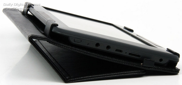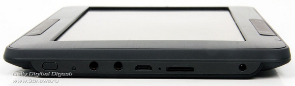 Все разъёмы вынесены на нижний торец ридера. Среди них есть два 3,5-мм гнезда: одно предназначено для наушников, а второе — для вывода видеосигнала на внешний приёмник. Переходник для ТВ придётся докупать отдельно. Кнопка питания и блокировки оказалась на редкость неудобной — она маленькая, слегка утоплена и к тому же болтается. А уж когда читалка находится в чехле, то попытка нажать на неё вызывает стойкие ассоциации с кличкой Бориса из фильма «Большой куш».