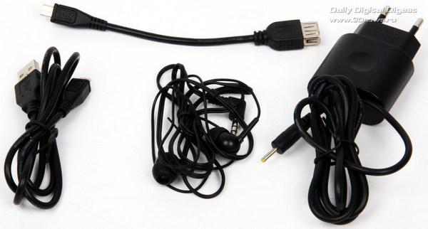 А вот заряжаться от USB читалка, похоже, не умеет совсем. Для этого есть отдельное гнездо и комплектное зарядное устройство. Слот для карт памяти способен переварить micro-SD объёмом до 32 Гбайт. К читалке также прилагаются простенькие наушники-затычки, кабель USB ↔ micro-USB и обязательная инструкция, она же гарантийный талон.