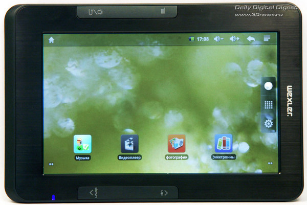 Управление Wexler.Book T7006 осуществляется с помощью двух кнопок-качалок, расположенных слева и справа от экрана, чуть ближе к нижнему торцу устройства. Правая качалка служит для перемещения по элементам интерфейса или перелистывания страниц. Левая же на одном конце имеет клавишу для вызова меню, а на другом — совмещенную кнопку «Домой» и «Назад».